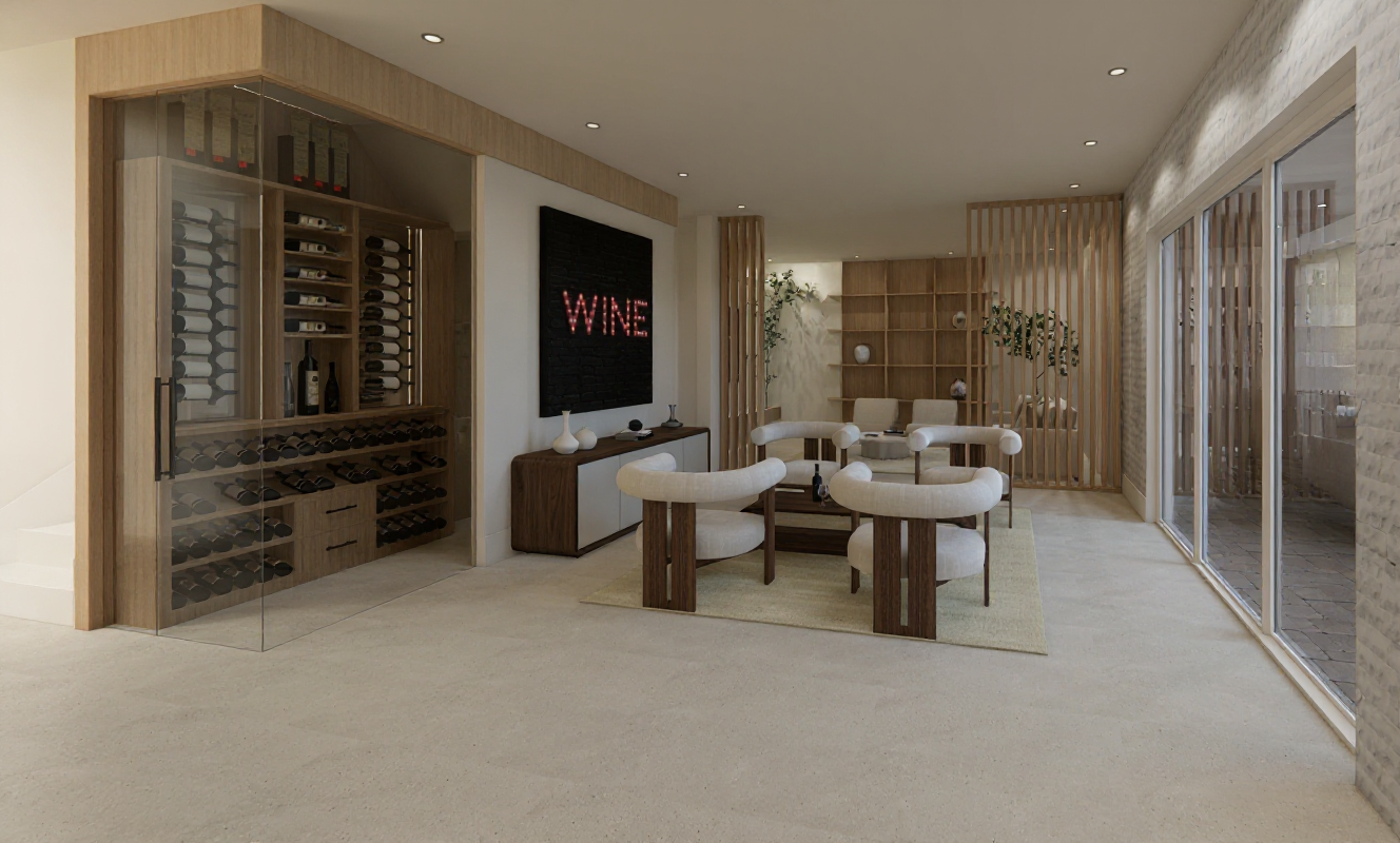 one large round stone planter bed centered between the two windows on the back wall with layered greens at varying levels and seating around the perimeter mirror this element on the other side of the entrance everthing should be farmhouse modern the greenery in the planter beds should be robust