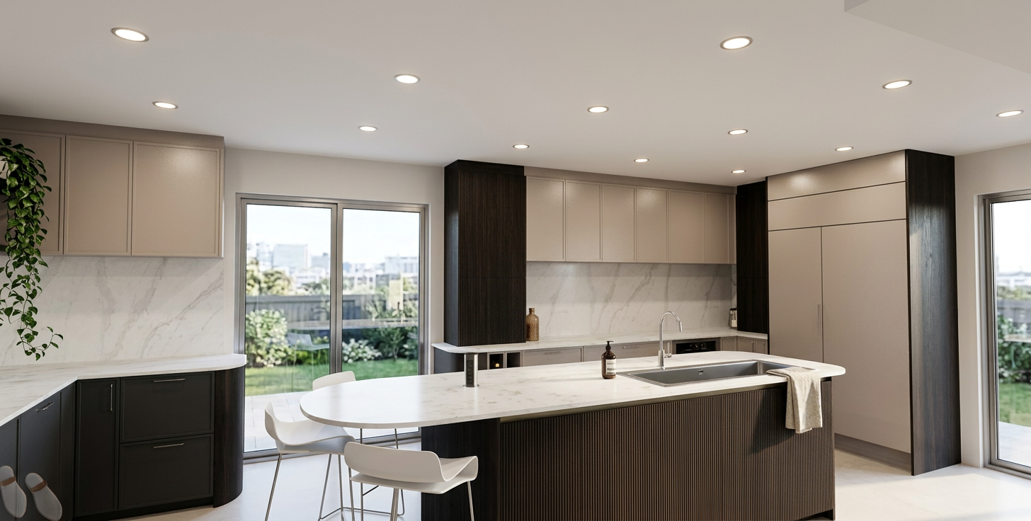 kitchen cabinets should be in a light aqua shade with shaker doors countertops should be white with light veining stainless steel appliances the feel should be beachy no window behind the sink remove the sink from the left side change the floor to a beige square tile