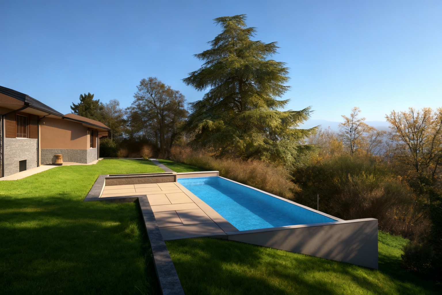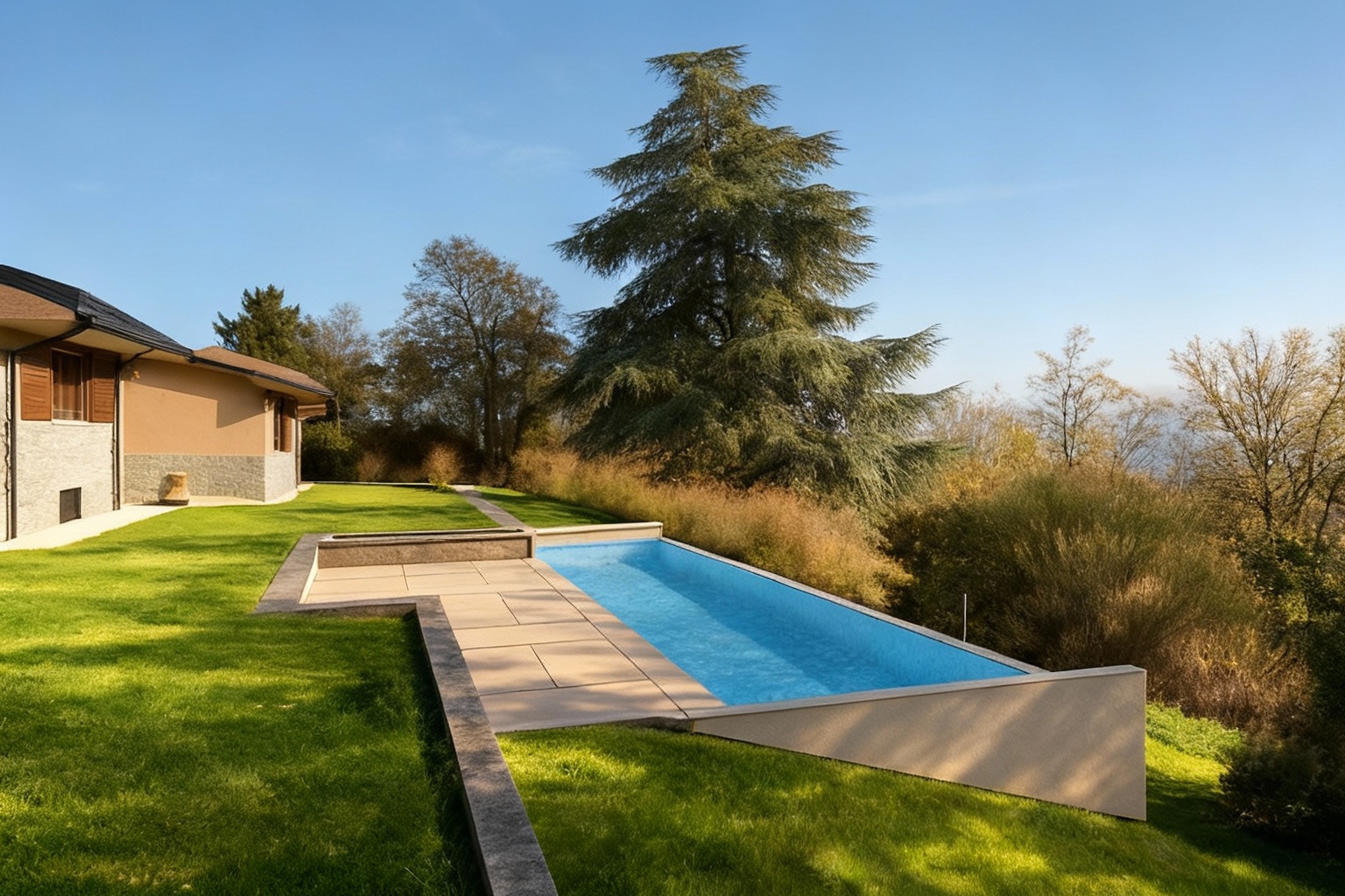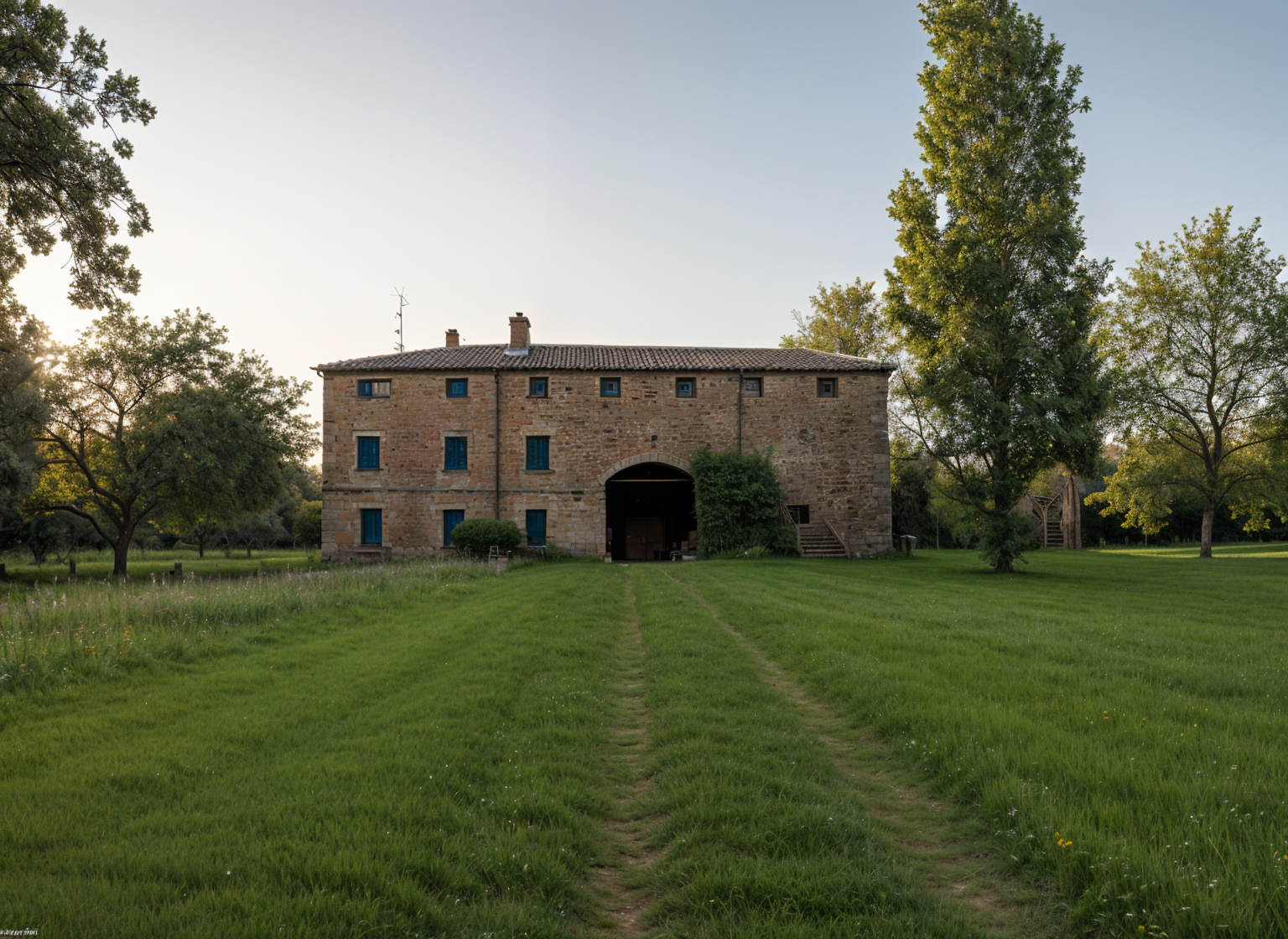 modernist exterior shot create a serene landscape featuring an old rustic house with warm weathered brick walls and a red tiled roof the atmosphere is peaceful and slightly overcast with soft diffused sunlight filtering through the clouds surround the house with lush green grass and tall trees their leaves transitioning from deep green to soft browns as autumn approaches the sky is filled with gentle gray clouds hinting at an impending rain add depth with shadows and subtle highlights to enhance the tranquil nostalgic mood of the countryside scene architecture