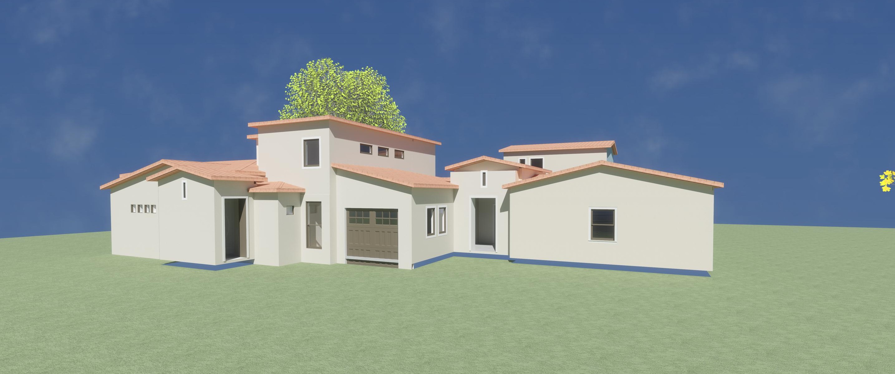 modern exterior shot farmhouse look with mexican tile roof add lots of landscaping and add driveway and walkways architecture