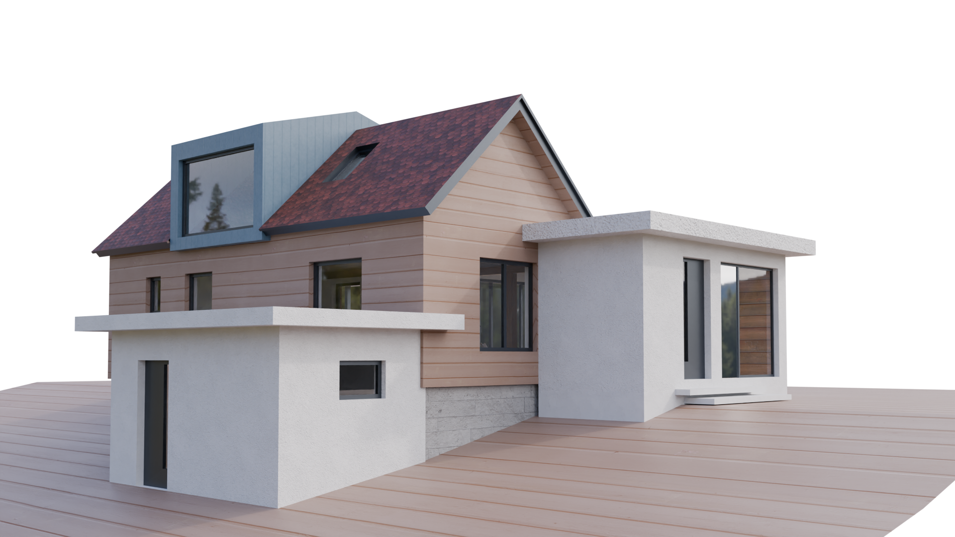 render a photorealistic 3d perspective of this house in rural setting next to tall pine trees not visible in the render viewpoint of attached pictureis next to the pine trees reference the current material style just enhance all used materials keep model geometry the same windows doors roof walls terrace make a natural lawn setting on terrain geometry in attached picture that looks native to croatian zagorje region do not change the view only enhance the current materials and make the landscape nicer vegetation detailed textures in the wood siding and glass reflections and a vibrant clear sky with light atmospheric depth render in hyper realistic architectural visualization quality 8k resolution