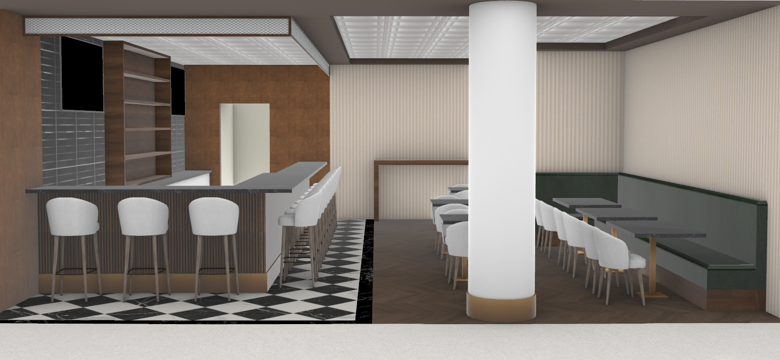 transform the provided restaurant interior image into a high end photorealistic render with warm dim lit atmosphere soft glowing highlights and relaxed upscale energy while keeping everything exactly the same same proportions same bar shape same booth seating same ceiling curves same wall finishes same materials and same spatial configuration add dim light can lights above the dining space on the right side of the image and a few dim lit glass pendant lights above the bar on the left side of the image without adjusting any of the ceiling structure do not move or alter any objects geometry textures colors or furniture positions the chairs throughout the restaurant must remain exactly in the same locations and proportions but their materials should read realistically the bar stools should appear upholstered in tufted brown leather with subtle natural sheen and cushioned tactile texture the dining chairs at the tables should be replaced with a bistro style chair using the same color as the bar stools while keeping their positions unchanged add premium table settings including wine glasses champagne flutes elegant plates cutlery and cloth napkins while keeping all tables and chairs in their exact positions include modern young guests seated at the bar and at selected tables casually social correctly scaled tastefully integrated without crowding or obstructing architectural details add two bartenders behind the bar preparing drinks and interacting naturally while preserving the bar s structure and alignment on the bar shelves add wine bottles and premium alcohol bottles arranged tastefully and evenly while keeping the shelving structure unchanged add sports games to the 2 shown tvs behind the bar without adjusting their locations add modern sports themed decorations to the vertically striped wall texture withy out adjusting any of the wall locations the shelving should feature warm and bright accent lighting enhancing reflections and bottle silhouettes lighting should emphasize a warm yet dim lit bar gentle reflections soft shadows enhanced color richness and luxurious catalog level realism improve depth and realism through wood grain richness marble shine brass highlights fabric texture and polished clarity while keeping the entire scene exactly as originally designed do not add any tables int eh foreground of the image and keep the white terrazzo shown transitioning into the bar floor