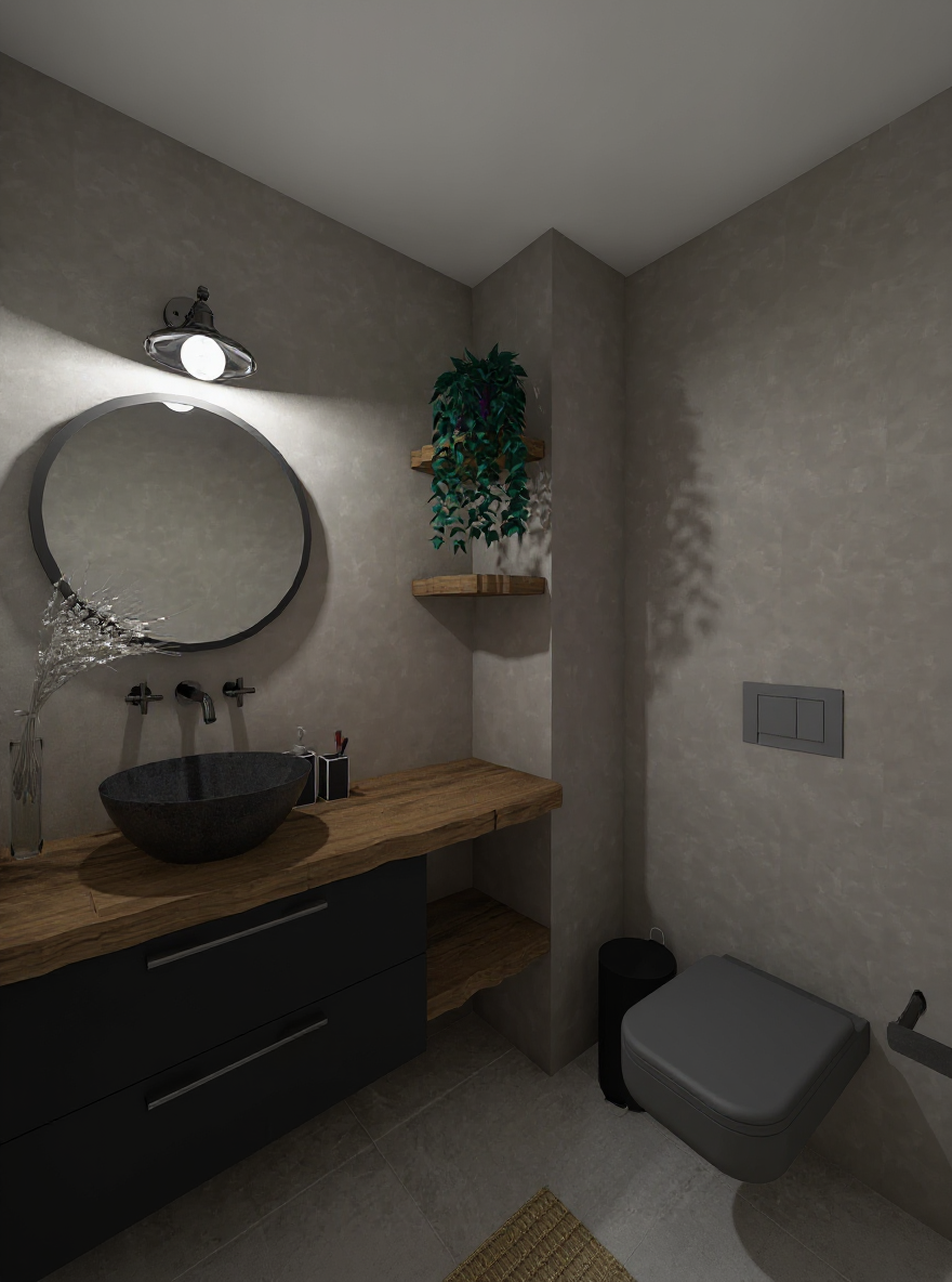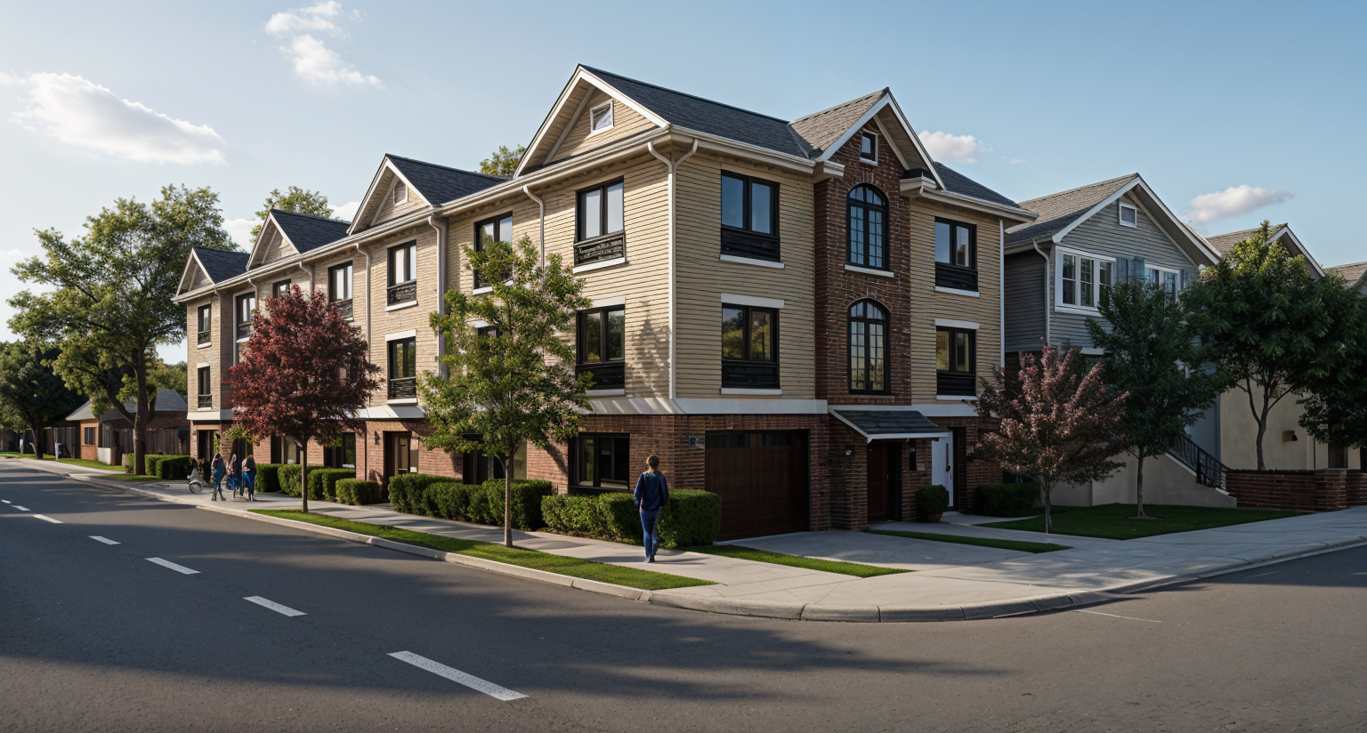 update the ambiance to a photorealistic image keep all original features of the building show people walking on a sunny winter day with a few clouds and snow the longer facade has only parking opening grills no glass