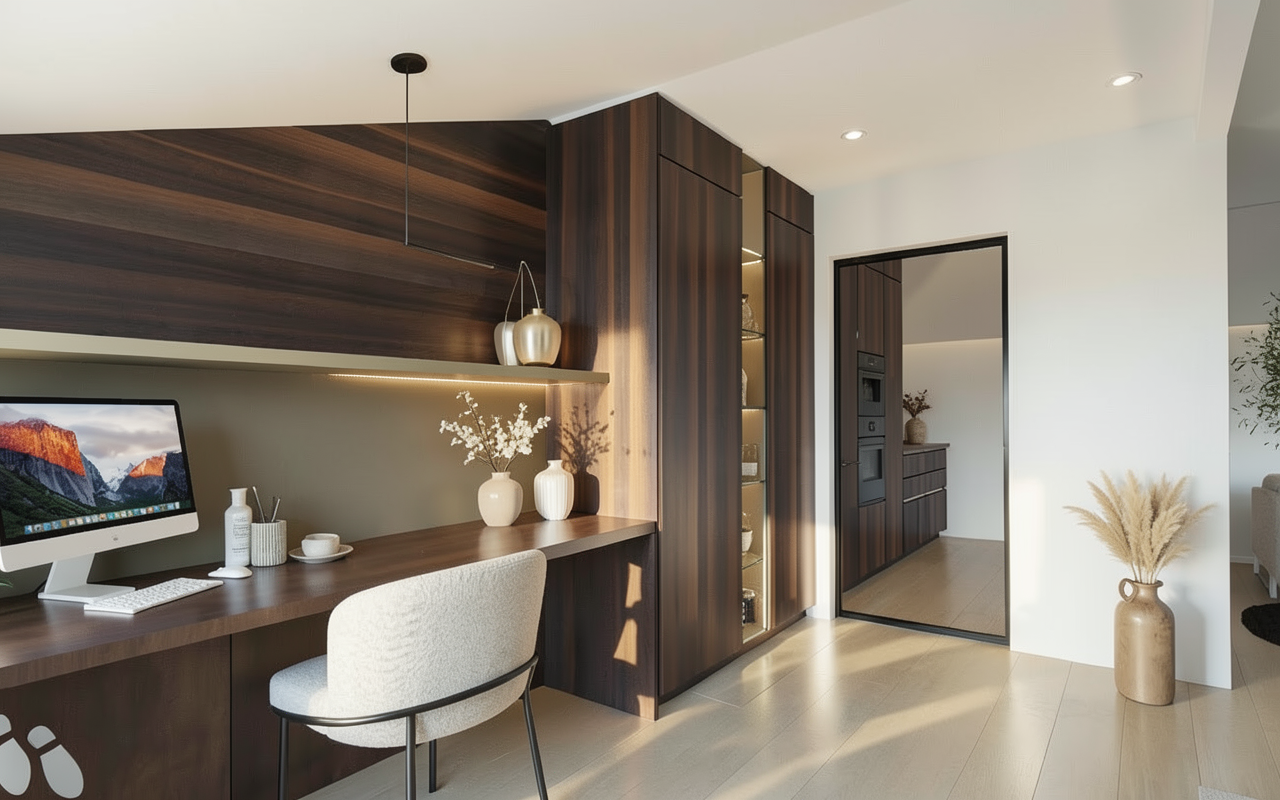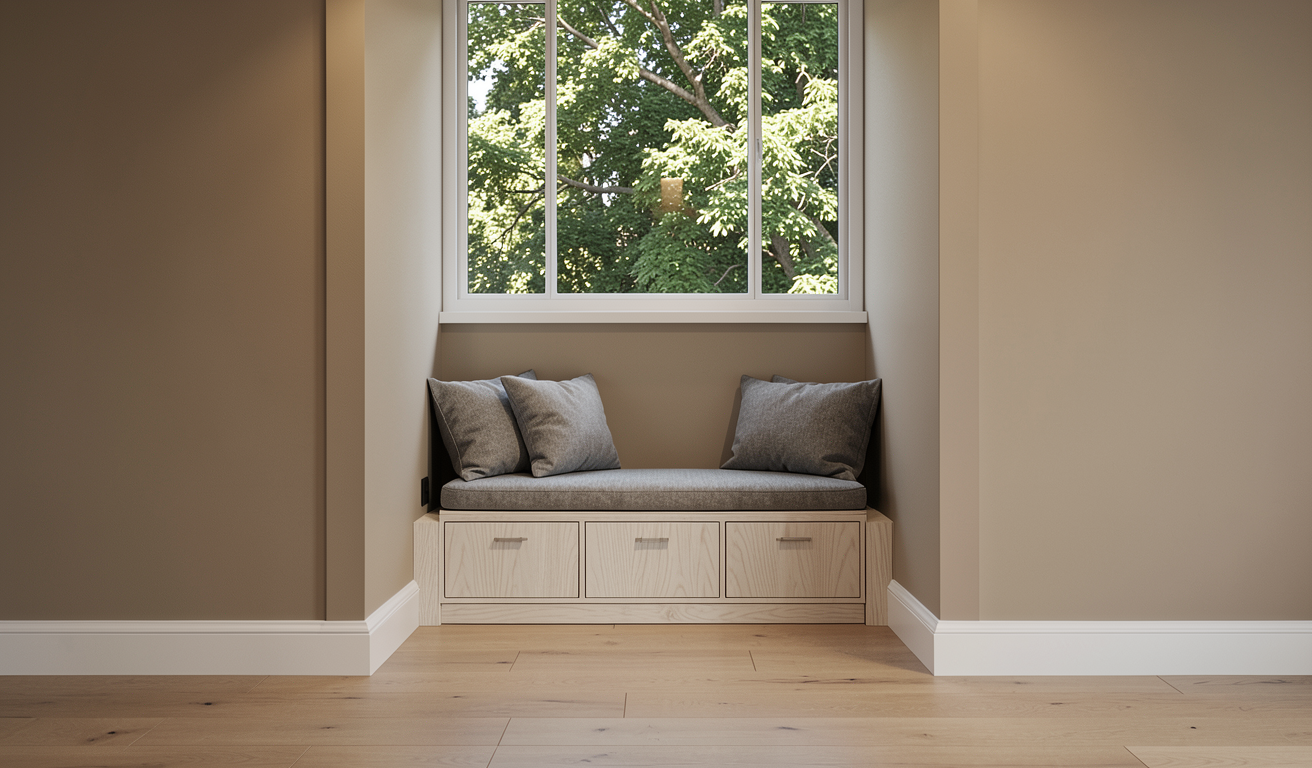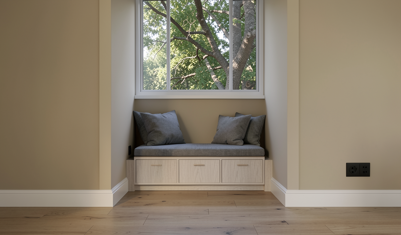 render this window seating without changing the design add a realistic 1st floor trees background on the window wall color a bit beige and skirting white make the bench material realistic change the material finish into white oak for the base and grey fabric for the cushion add pillow cushions remove led strip make the lighting a bit dim don t change the color of the socket still use black dark grey