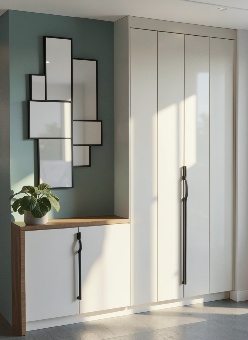 render a modern two story house with a flat roof the upper section features rich wooden panels in a warm walnut brown the lower section is adorned with sleek gray stone in a polished slate color accented with white stacked stone pillars for contrast large windows have soft white frosted glass creating an inviting ambiance the garage door matches the wooden panels and the front door is a similar wood tone with a sleek metal handle surround the house with a lush green lawn and set the scene under a clear blue sky giving a fresh and peaceful atmosphere