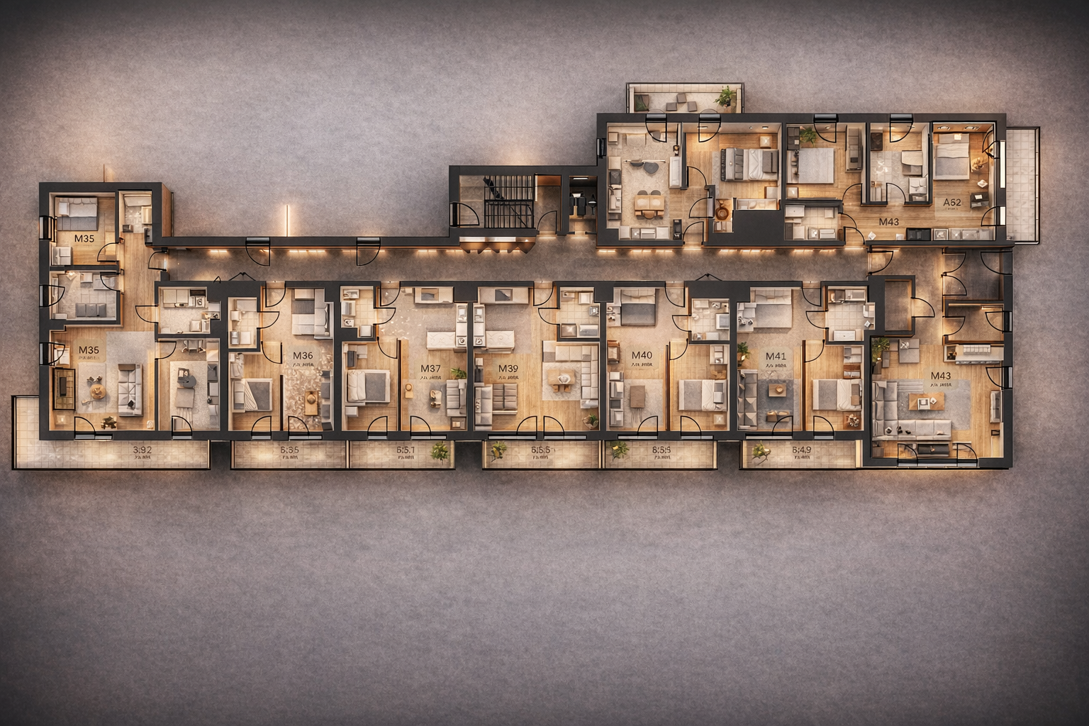 high detail 3d top down floor plan visualization of a modern residential building floor based exactly on a provided architectural blueprint preserve the full layout proportions and geometry of the reference plan units m35 m43 layout strict replicate the exact footprint and corridor layout long central corridor with apartments on both sides keep all walls doors and room divisions preserve apartment shapes and sizes include balconies along fa ade include staircase and elevator core apartments realistic interiors fully furnish each apartment in a modern style living room with kitchenette sofa table kitchen cabinets bedrooms with beds and wardrobes bathrooms with realistic fixtures natural layout based on real proportions match room count per unit small units 1 bedroom medium 1 2 bedrooms largest m43 3 bedrooms corridor style match references exactly corridor must be visually distinct and premium copper bronze metallic wall panels warm brown walls and ceiling dark grey graphite large floor tiles dark anthracite doors modern led lighting warm tone linear or square soft ambient lighting interior style apartments bright modern interiors light wood floors neutral colors white beige light grey scandinavian modern minimal style natural lighting from windows render style top down 3d isometric orthographic view high detail realistic materials soft shadows and ambient lighting marketing quality architectural visualization clean composition slightly elevated perspective subtle depth and realistic textures quality boost ultra realistic architectural visualization premium residential development 4k soft lighting global illumination high detail materials
