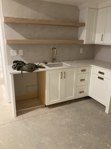 do not change the cabinets in any way preserve the exact cabinet colors materials finishes dimensions door and drawer styles hardware spacing alignment and all geometry exactly as shown do not alter the countertop shape backsplash appliances flooring lighting fixtures or wall structure only remove the construction materials clutter and mess from the scene clean the room and make it look finished and staged add a few simple tasteful home accessories appropriate for the style of the space but do not add or remove any furniture windows or architectural elements maintain the original lighting direction and realism enhance clarity and polish the photo while keeping the cabinetry and room design completely unchanged do not alter the lighting to keep the cabinet colors as they are in the image add an undercounter fridge in the opening add flooring stage for a wet bar