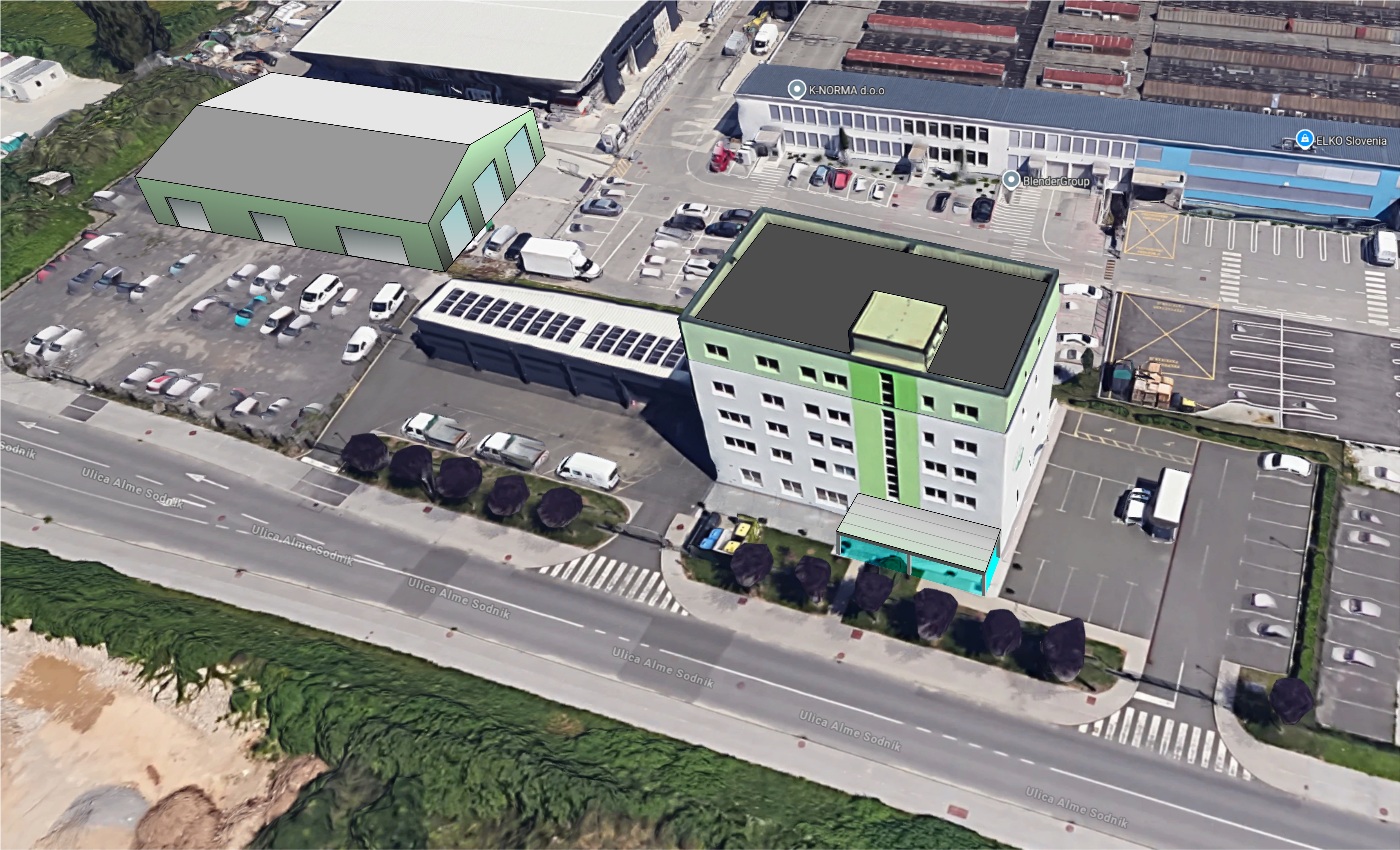 exterior shot do not change anything mainatin perspective just polish make tent on the left realistic industrial hall darker colour keep other colours architecture