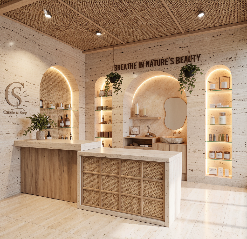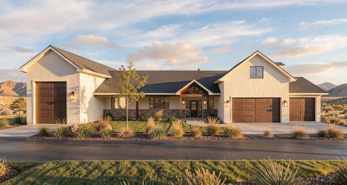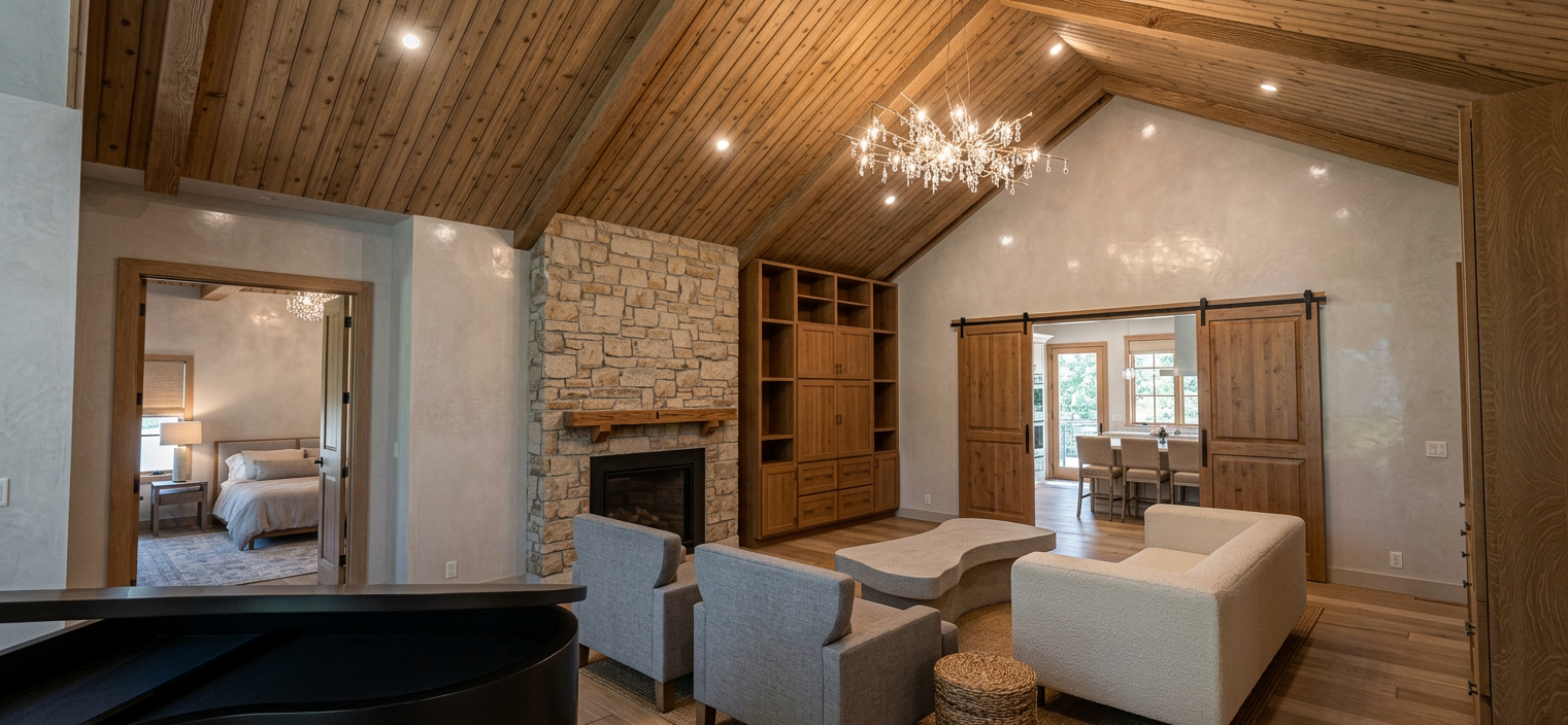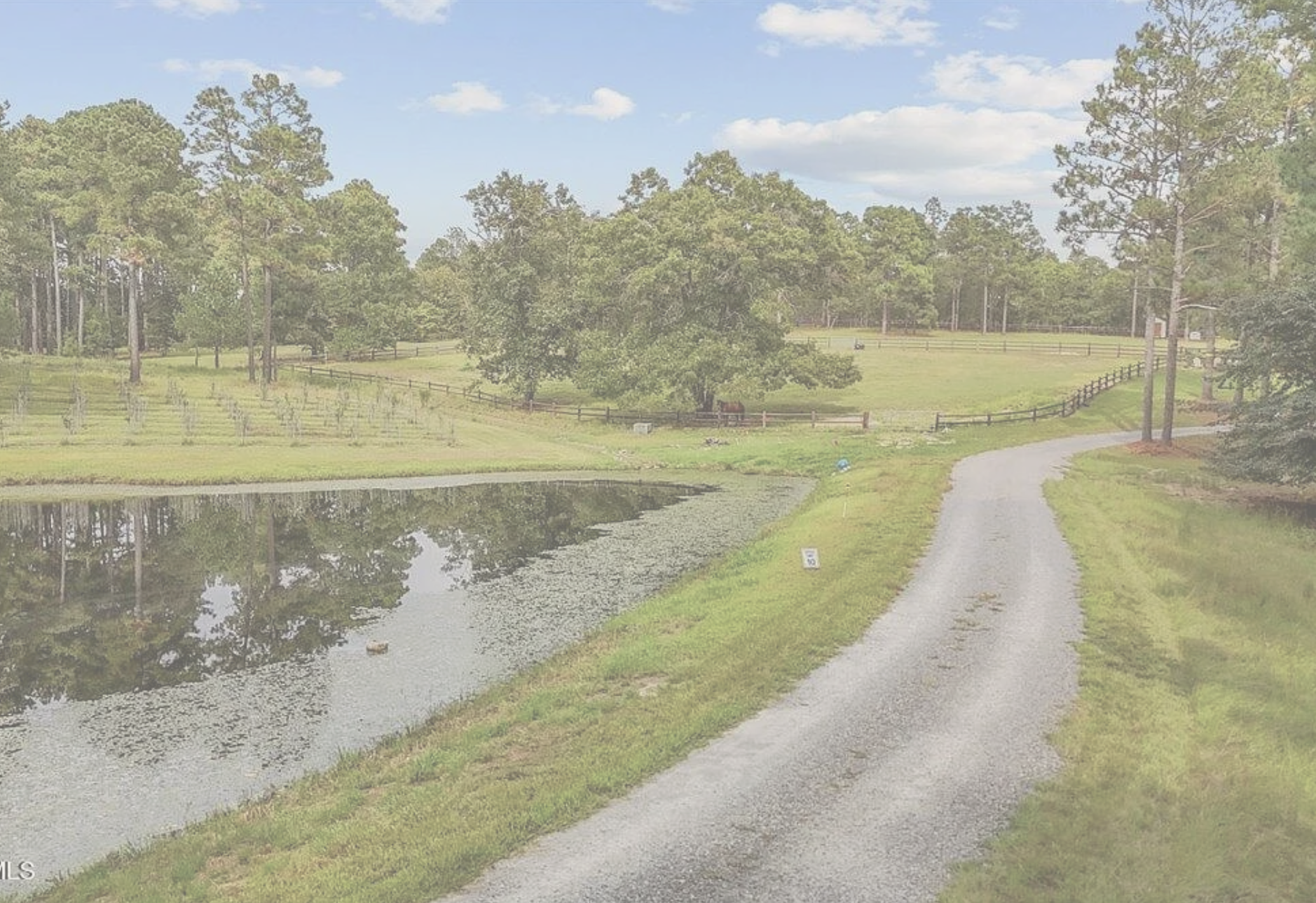 in the distance above the pond back by the pine trees a single story home at center flanked to the right by a garage building and to the left by a two story residential home the compound is connected by covered breezeways the style is scandinavian and the exterior is clad in vertical cedar siding with lots of glass windows there are rustic modern architectural elements