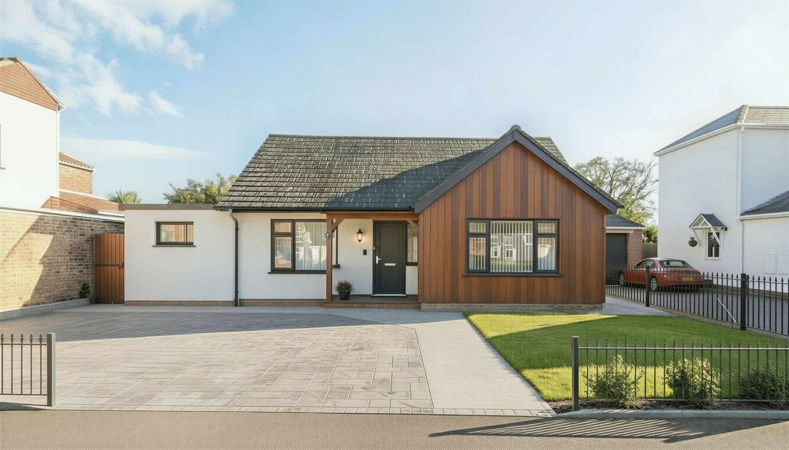 add a pitched roof with the same eaves height and a 1m lower ridge height to replace flat roof on the left side keeping everything else exactly the same as the source image