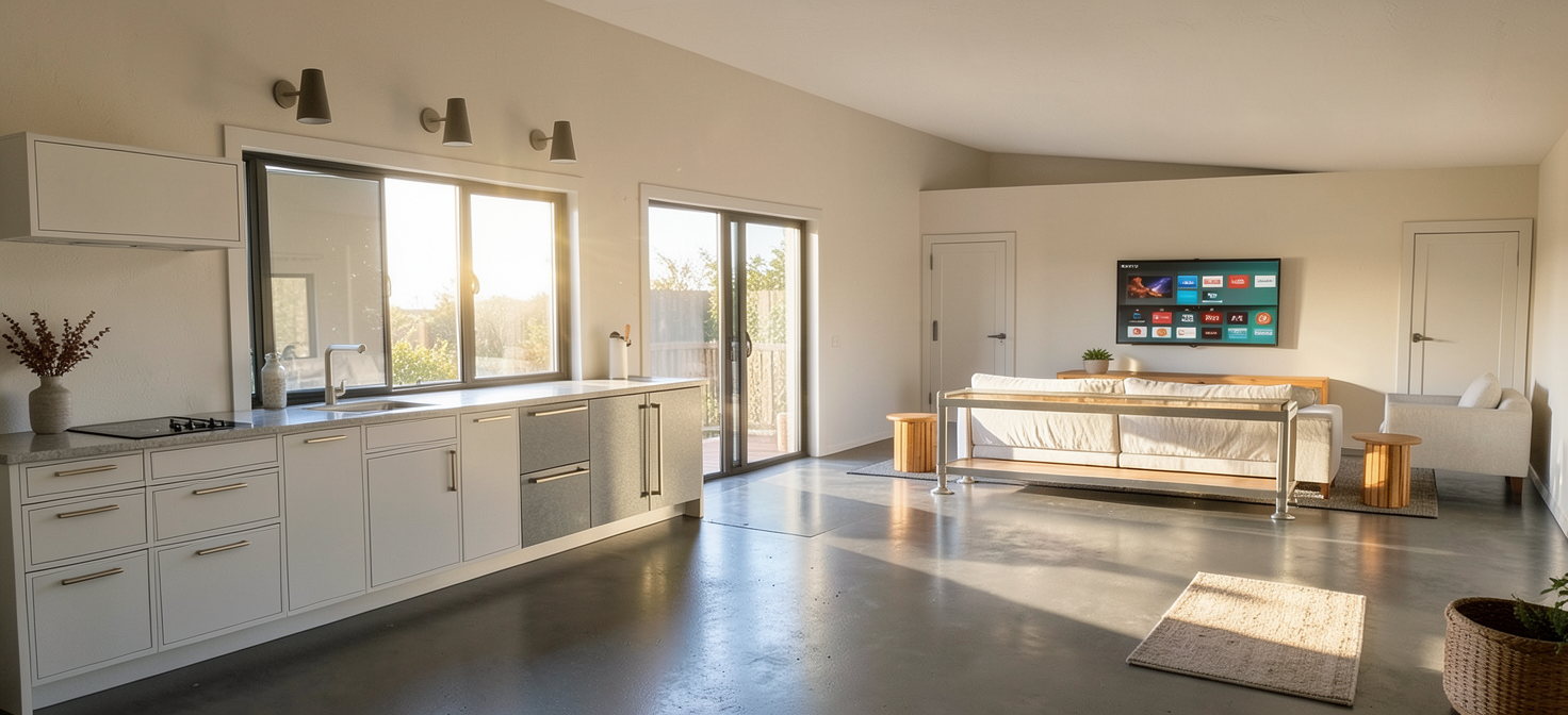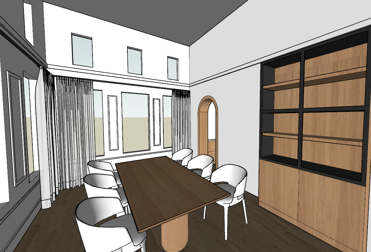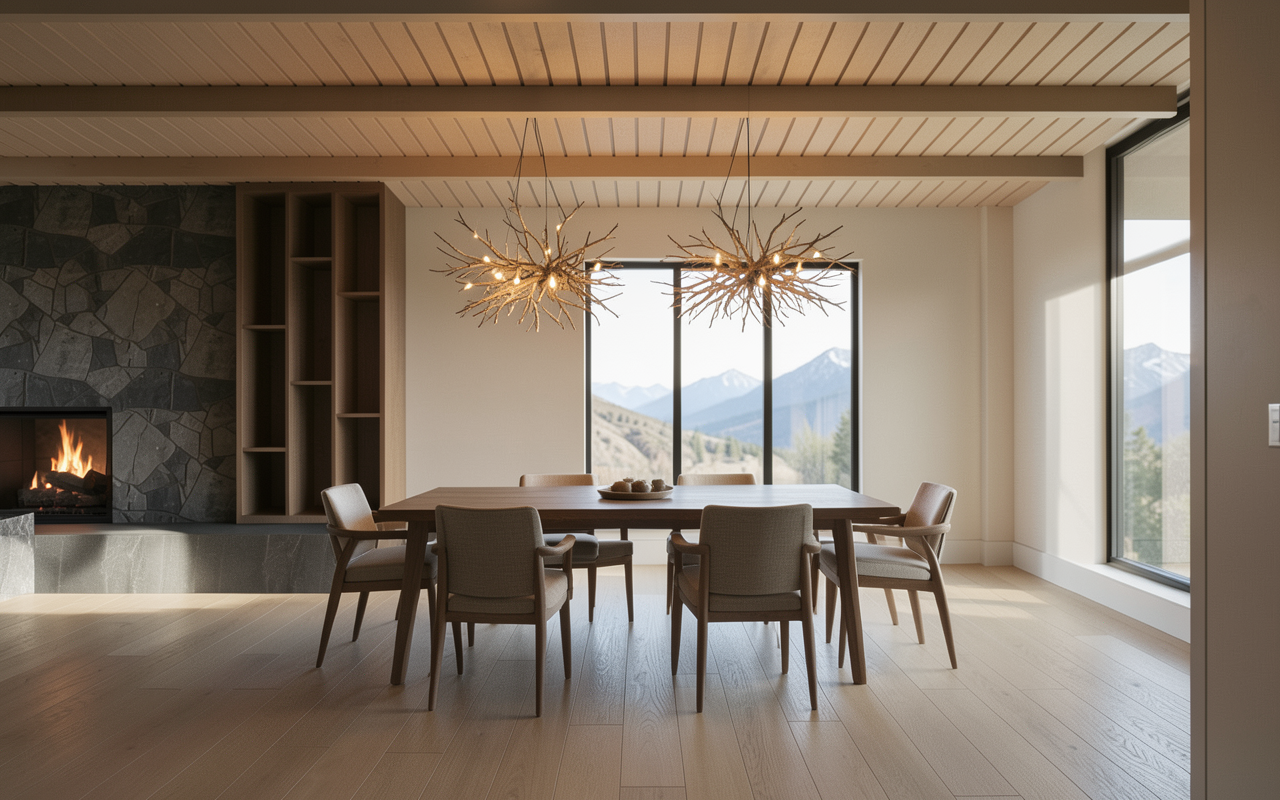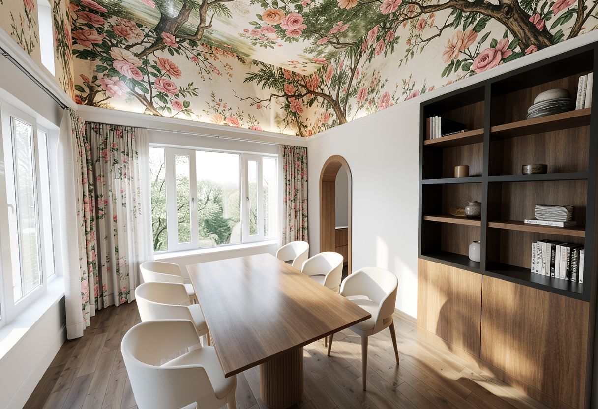 nutral beige wallaper no pattern on the ceiling glass buffet