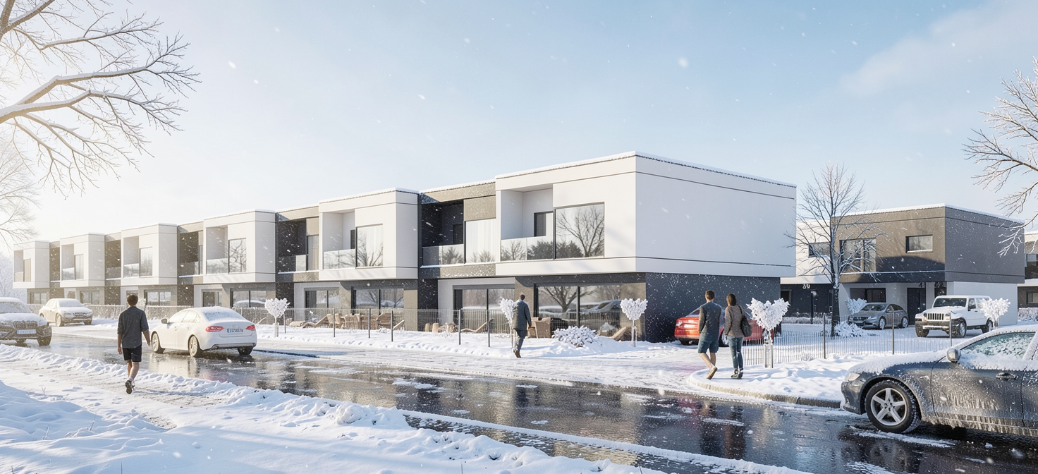 create a photorealistic view do not change the shape of the buildings do not add any inscriptions do not change the inscriptions of numbers and registration plates summer do not change the shapes or divisions of buildings autumn view