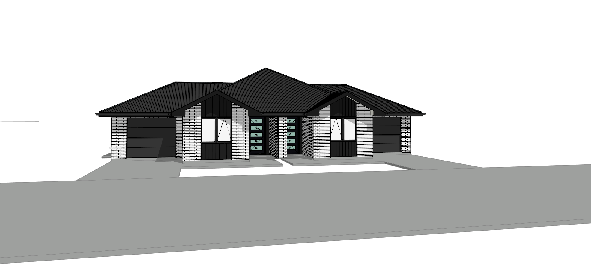 white brick black wood with a driveway and fencing short grass