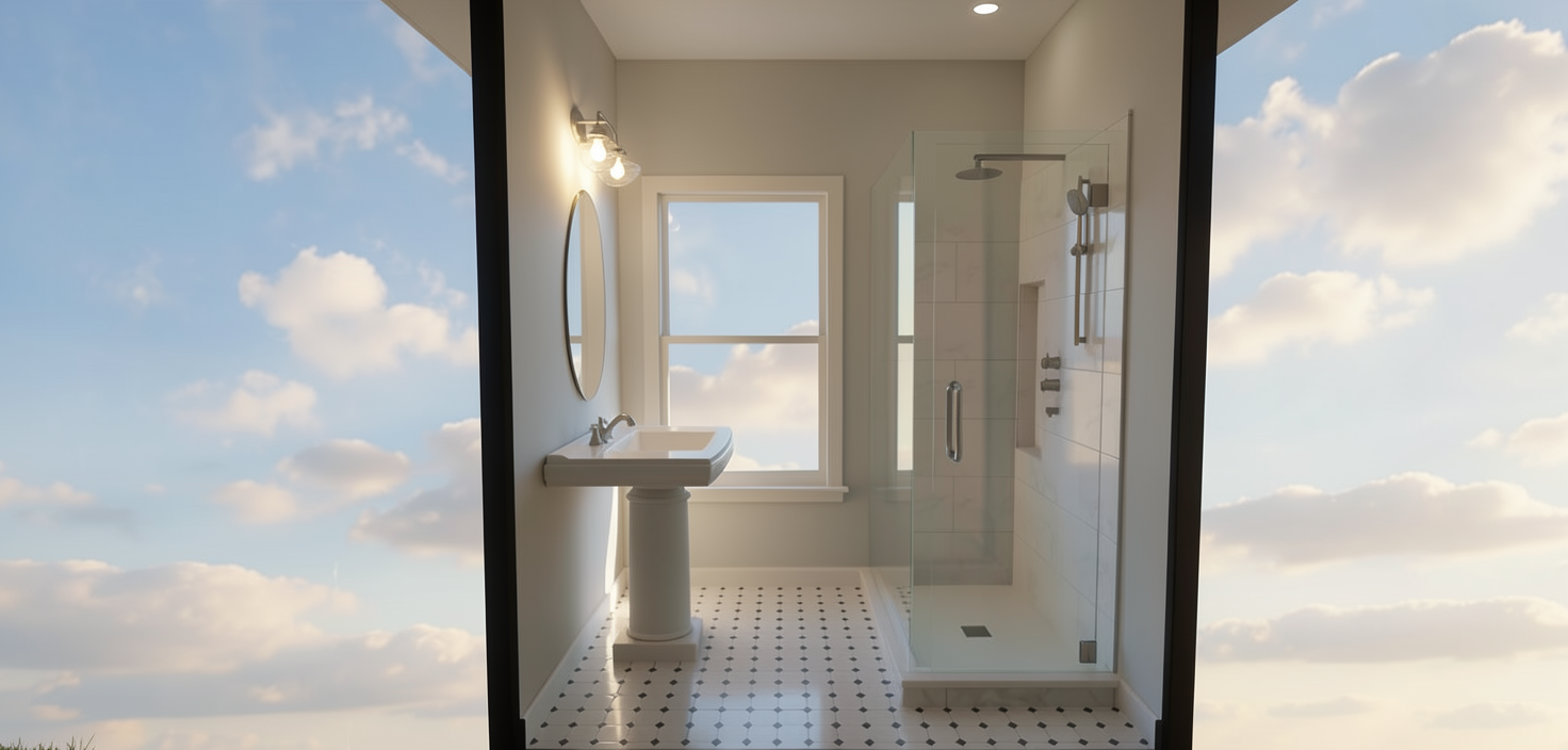 make a photorealistic render of the building above the royal blue should be vertical dark wood slats green should be limestone cladding pink should be reflective glass yellow should be a dark metal flashing purple should be cmu navy blue should be grass red should be asphalt make photo realistic