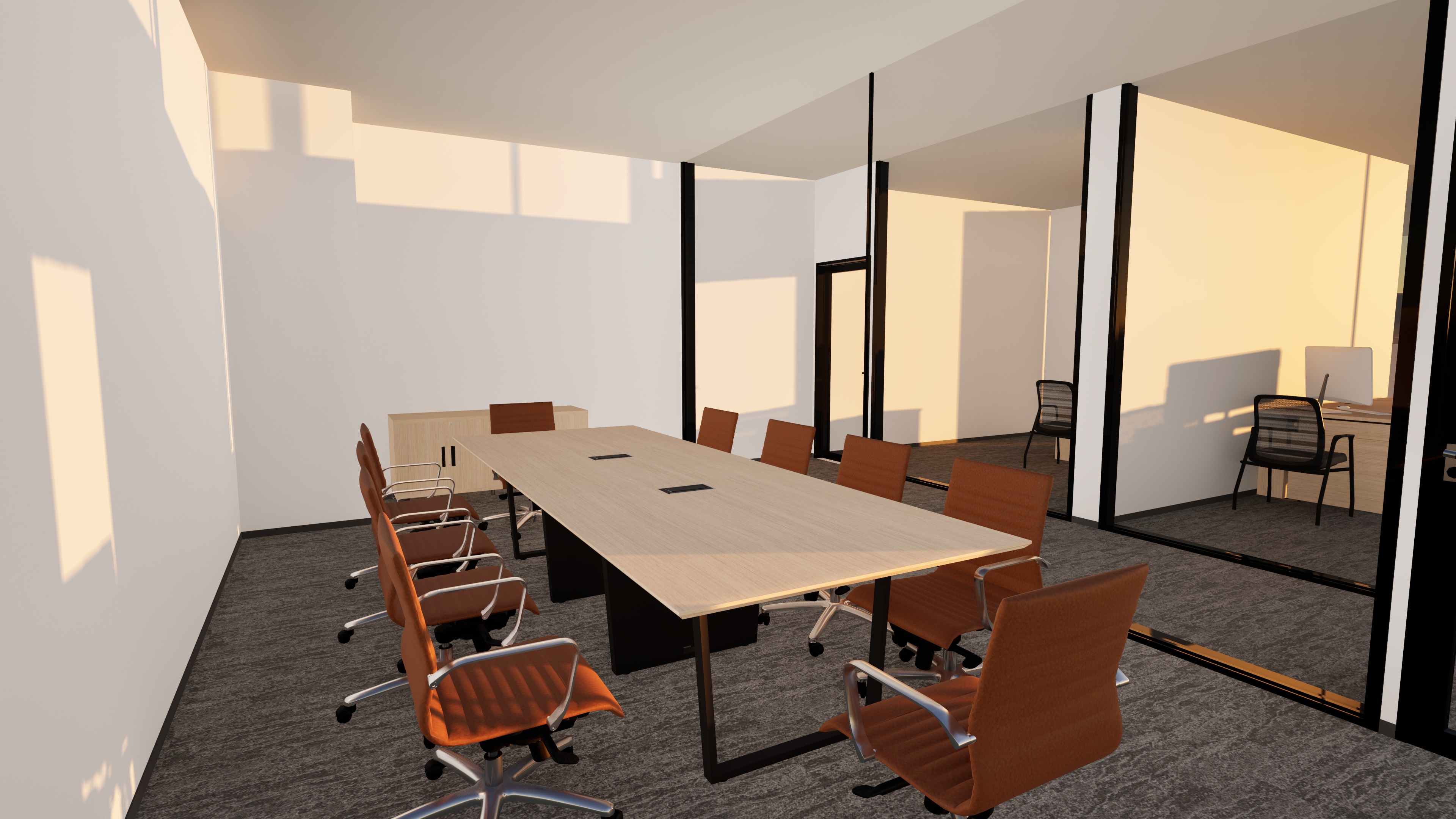 add decor make more realistic add someone sitting at the desk do not change any of the furniture or materials improve the lighting and reduce shadows add a tv on the back wall the table is white oak