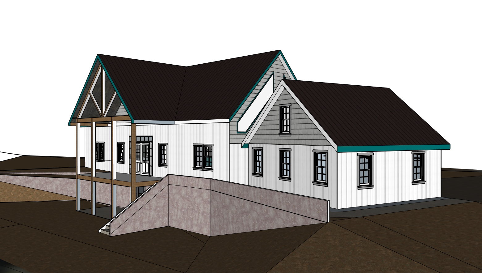 standing seam roofing green grass on the ground with mell balanced landscaping that last one was great other than the pool is a seepage bed for septic also take the woods on the right back about 20 from the front add an appropriately sized cupola centered where peaks meet remove trees in sample road runs along front of home make the house grand farmhouse vibe same layout and aesthetic add oak railing with black spindles at appropriate locations porches walkway should connect to driveway make it ultra realistic like in a country magazine