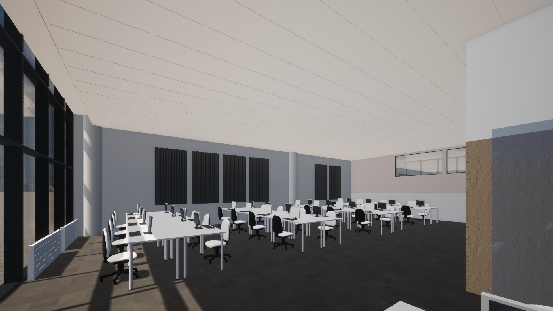 make this picture realistic use light oak where is wood on wall ceiling is suspended tiles white floor is carpet tiles gray