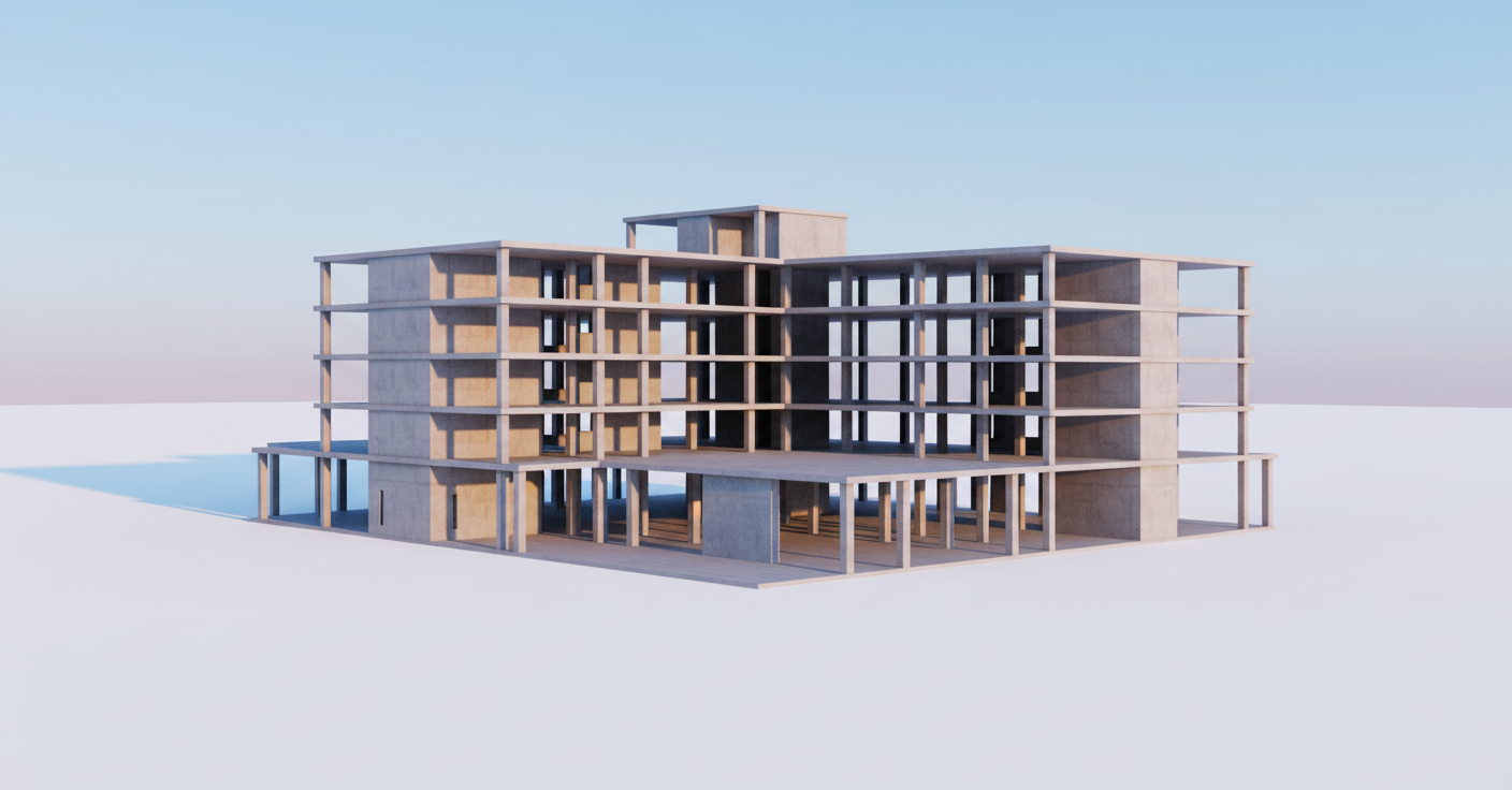 modernist exterior shot concrete only shell structural clean concrete white background shore walls only at the corners and at the top on the closest wall architecture