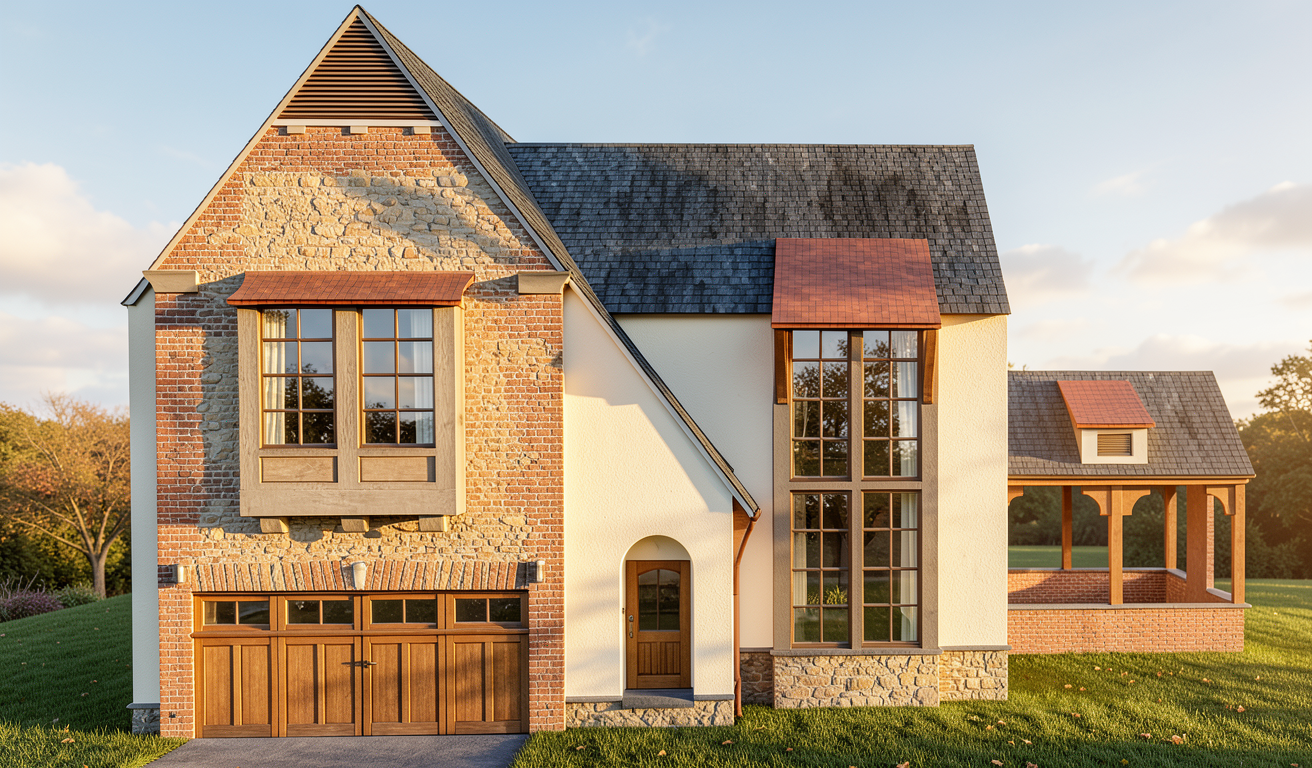 make it less animated warm up and make clearer make exterior background look more realistic make board and batten siding cream coloured window and window trim must be a greige colour stone is tuscany rubble by canyon stone