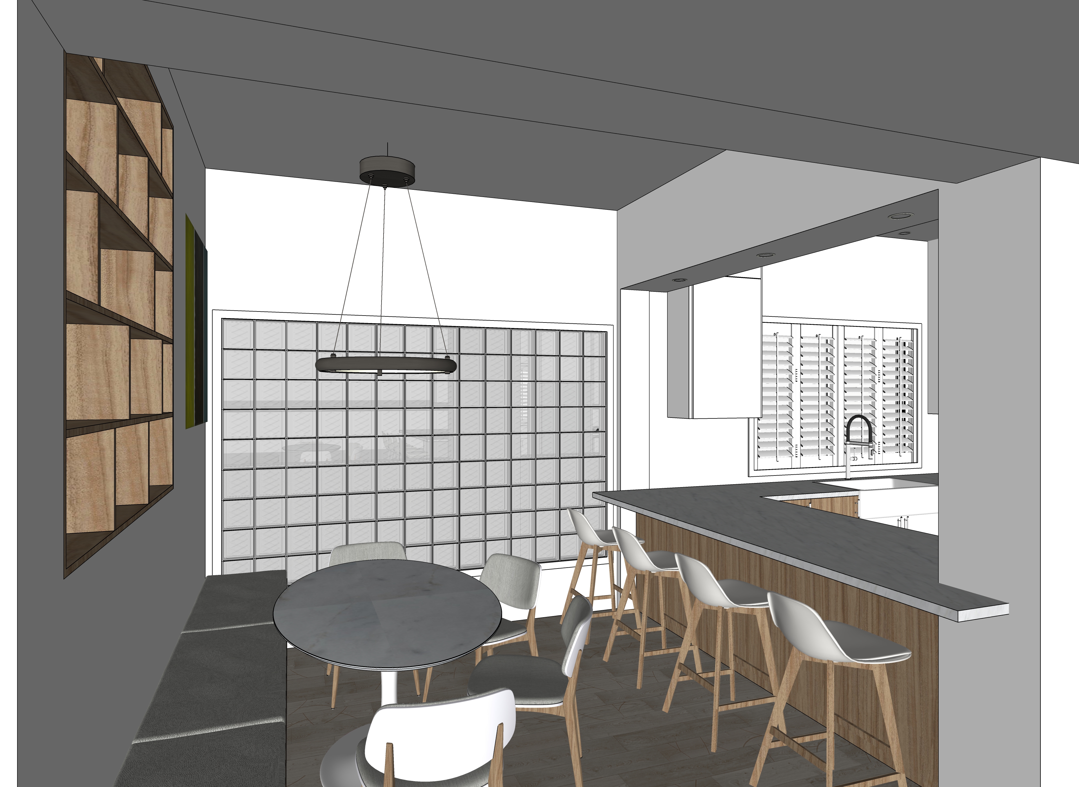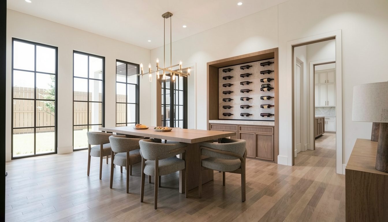 add light from the chandelier over the dining table add light from the recessed lights enhance the materials in the source image