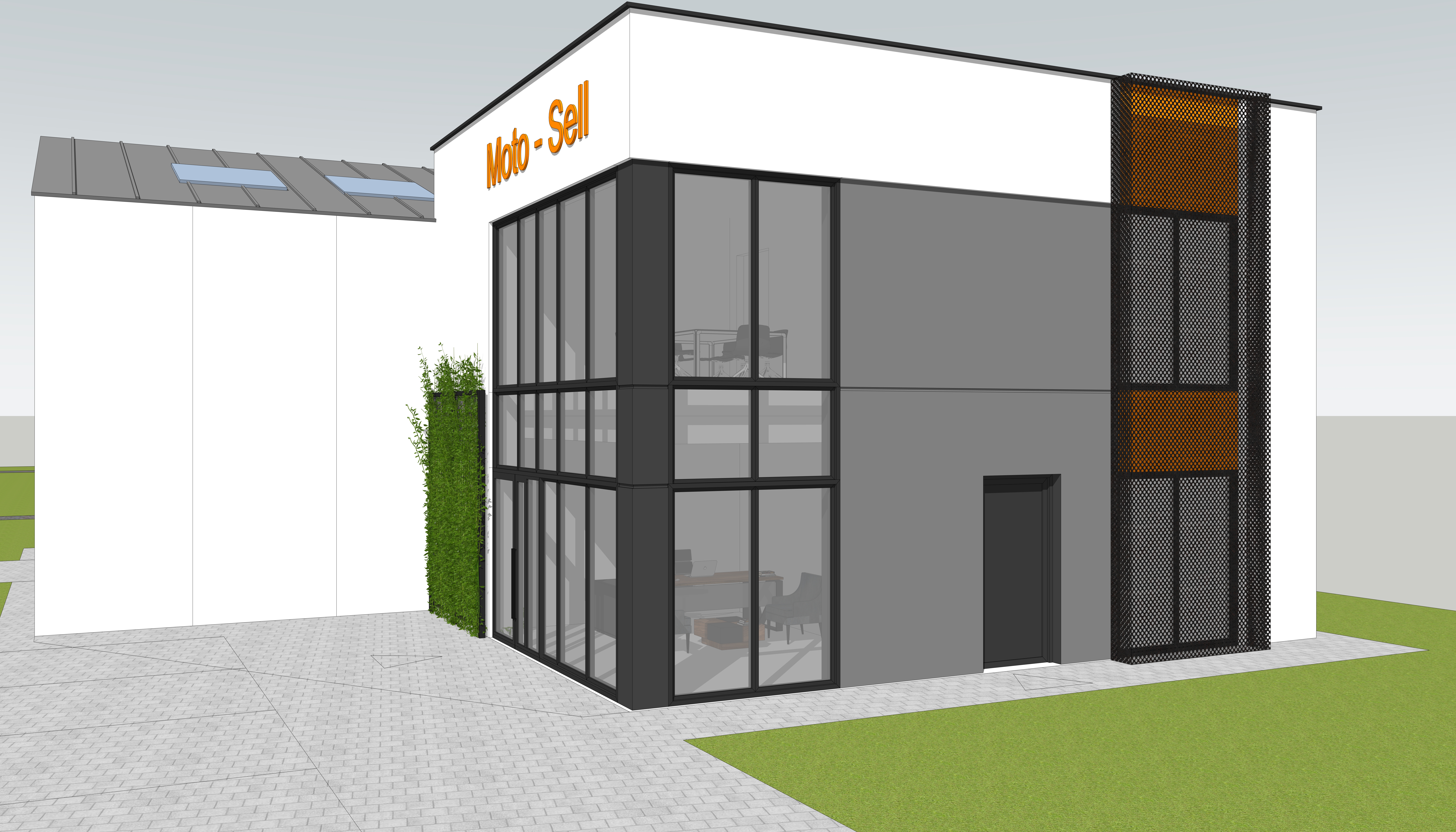 modern architecture showroom with a sleek minimalist design two story building featuring a white facade accented by large dark gray framed glass windows the logo moto sell in vivid orange at the top the building s sides and rear feature contrasting dark panels and orange accents lush green ivy grows on one side of the building for a touch of nature a neatly paved sidewalk in light gray tones surrounds the structure with well maintained bright green grass adding vibrancy calm clear sky with soft natural lighting for a peaceful atmosphere