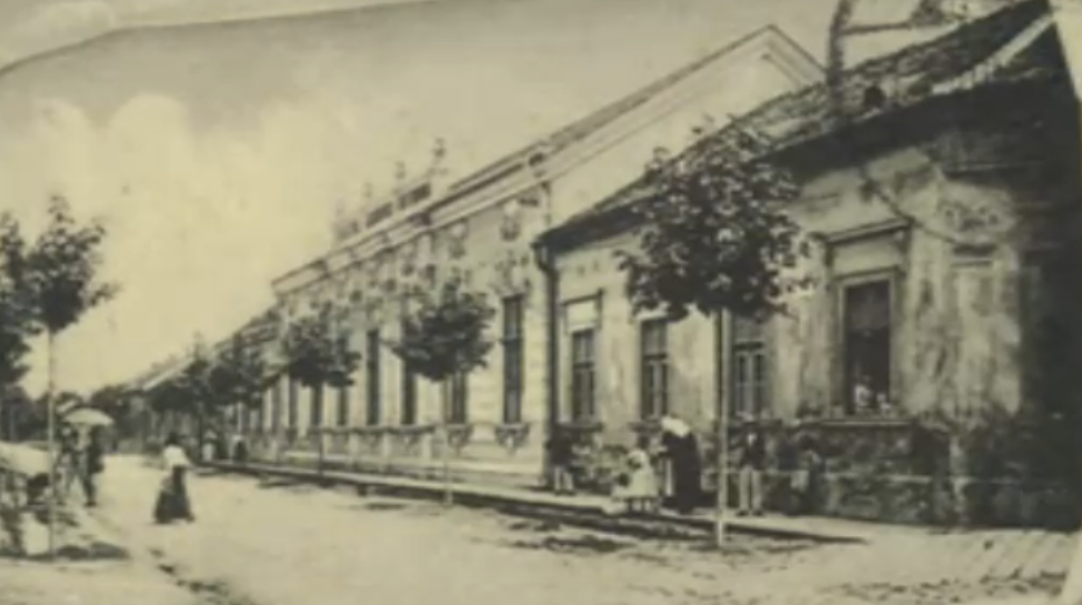 sunny day beautyful clouds stucco fassade people in 1900 s fashion style remove text from the picture