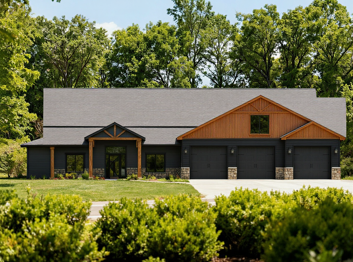 black siding windows shingles solid garage door stained columns and gable accents remove dormers and chimney