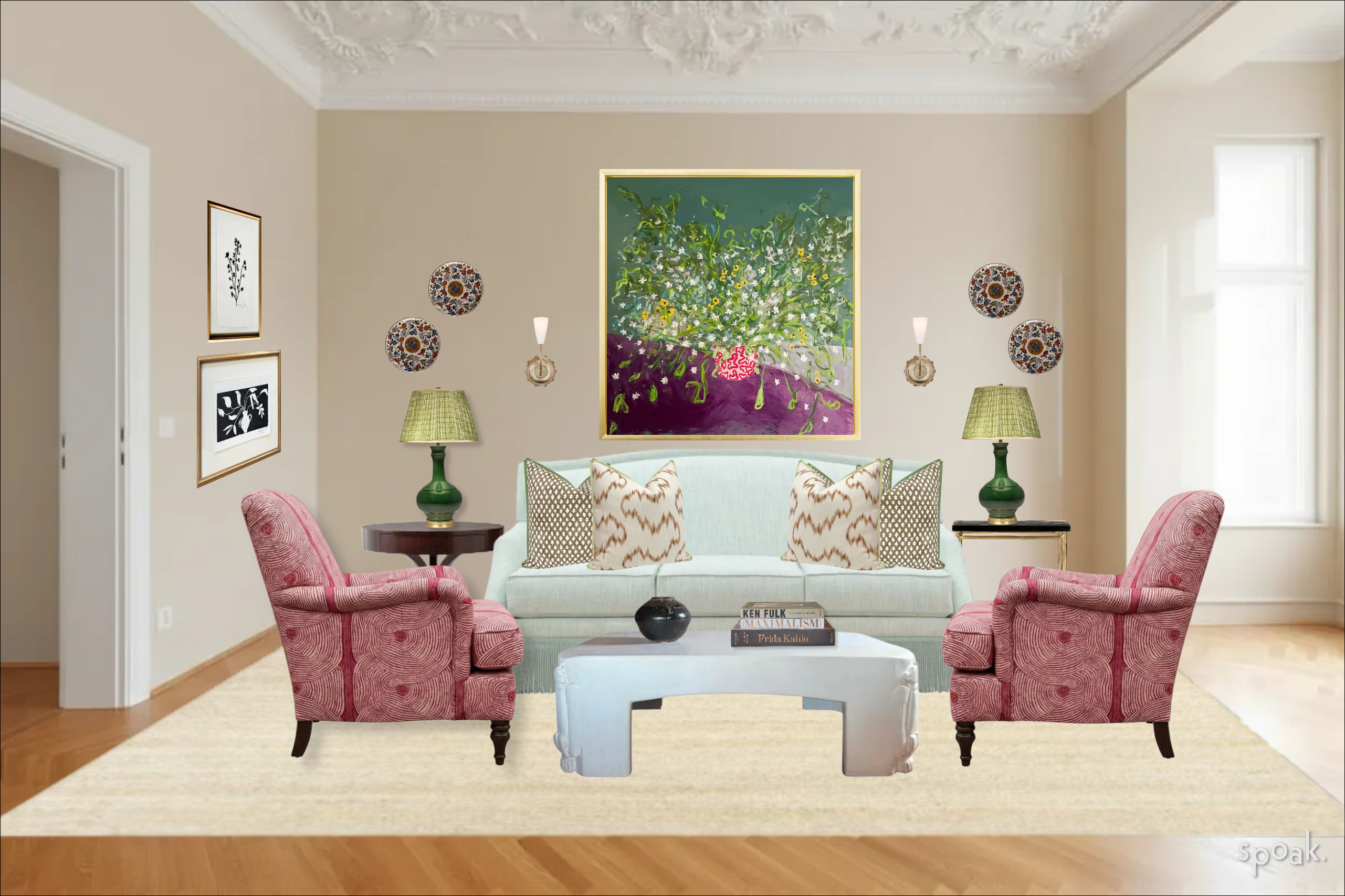 photorealistic architectural editorial photography enhance physical realism only do not alter objects geometry layout materials patterns artwork or color values preserve all original design elements exactly as provided add accurate natural light behavior with soft directional window light physically correct shadows with contact shadowing at base of objects realistic light falloff and depth subtle ambient occlusion in corners and where surfaces meet enhance material realism true to life fabric texture and weave detail natural wood grain depth realistic glass transparency and refraction accurate metal reflections mirror surfaces must reflect adjacent wall and environment correctly add lens realism slight depth of field very subtle natural exposure balance soft highlight bloom fine film grain micro surface imperfections editorial photography quality similar to architectural digest maintain original composition no stylization do not alter patterns on pillows chairs or art on the walls
