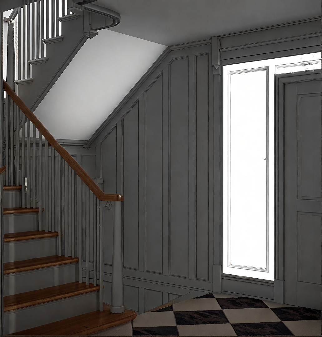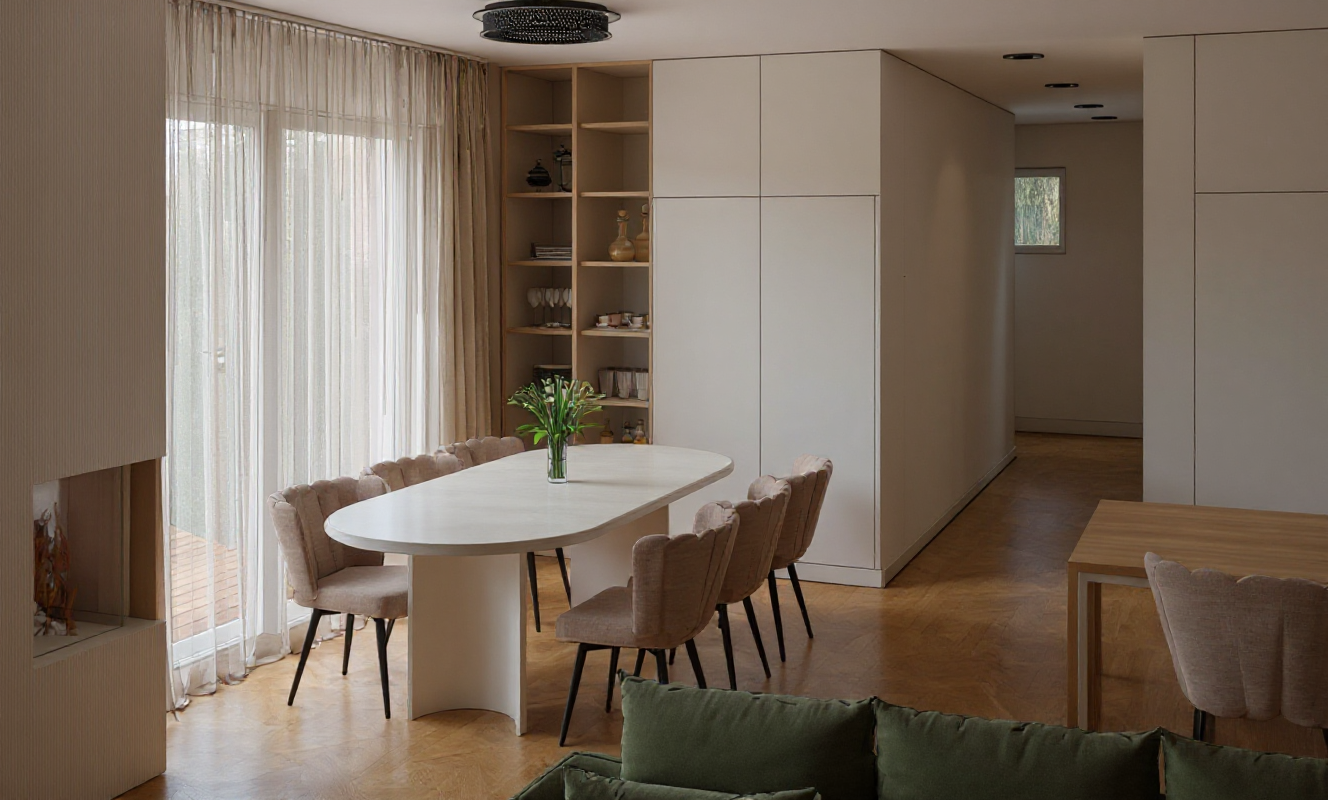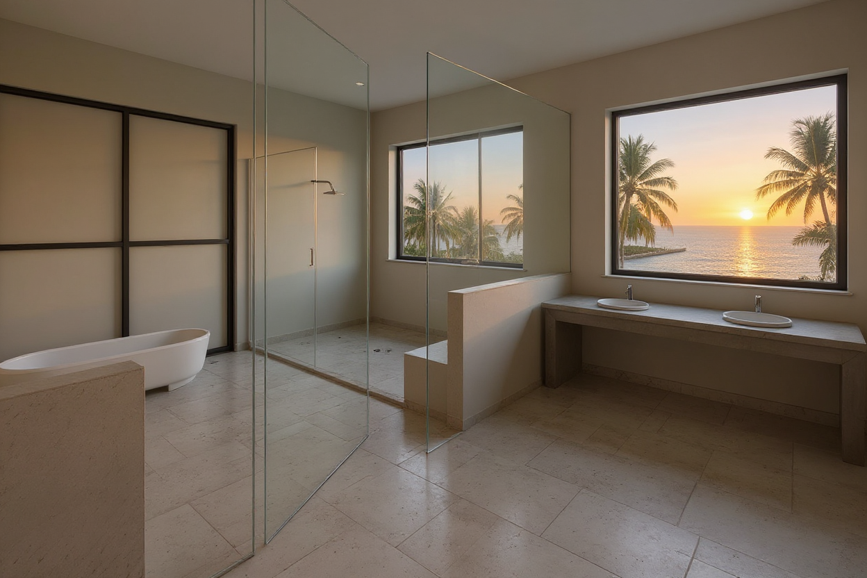 modern bathroom pale stone tile floor light colored walls window look out to a tropical bay with setting sun and palms nearby to the left is a window with mirror over vanity