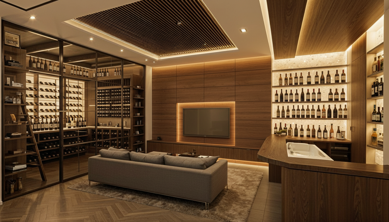 chatgpt said create a high end photorealistic still render based on the provided interior image keep all architecture joinery furniture shapes proportions materials and spatial configuration exactly the same do not move or alter any walls ceilings shelving glazing flooring bar geometry or media wall layout the wine room on the left must remain identical in layout but appear fully stocked with wine bottles in all racks with the wall behind clearly rendered as richly backlit stone that matches the warm tone and character of the backlit stone behind the bar emphasise realistic reflections in the glass and depth in the timber and stone in the centre of the room add a comfortable contemporary sofa and a soft textured rug facing the tv behind the tv the wall panel must be finished in a soft fabric with visible tactile texture indirect lighting should emit from all recesses around the media wall ceiling coffer and plinth creating a warm evening ambience with soft gradients and subtle highlight roll on timber surfaces on the right keep the curved bar exactly as designed the backlit stone panels behind the bar should glow with rich translucency and crystalline variation the timber shelves must remain in the same positions but display premium wine and spirit bottles arranged neatly and evenly add modern young adults to activate the space one or two guests seated casually on the sofa facing the tv two bartenders behind the bar preparing drinks and one guest at the bar interacting with them all people must be correctly scaled tastefully dressed and integrated without blocking key architectural features overall lighting should convey a warm evening atmosphere with glowing backlit stone refined wood grain realistic glass reflections and luxurious catalogue level photorealism while preserving the original design and geometry of the entire room