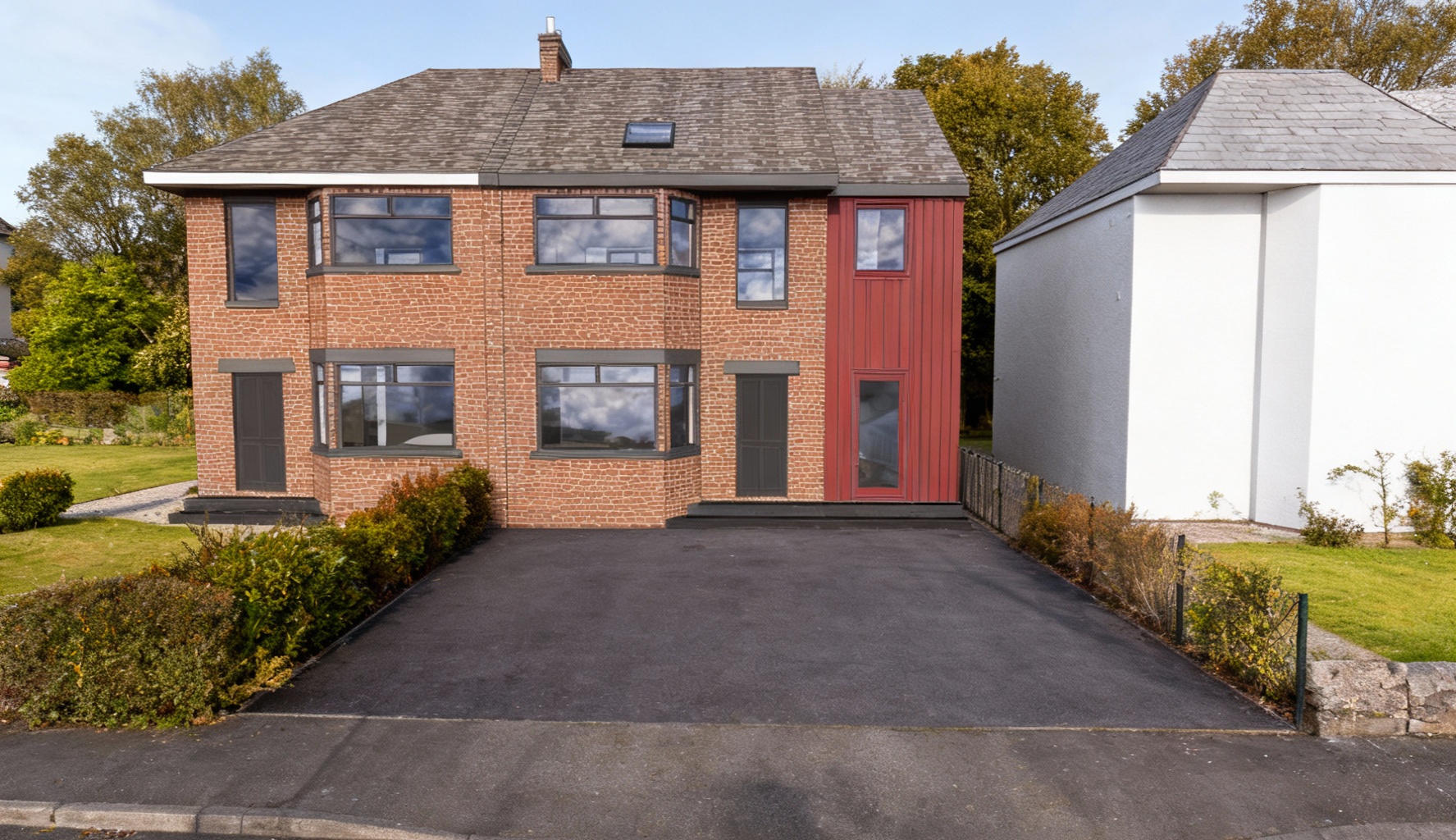 transform technical elevation drawings into a realistic architectural render modern scandinavian single story house with horizontal wood cladding in dark grey black window frames flat roof large glass openings add natural daylight soft shadows and clean background surround with simple landscaping trimmed grass subtle plants light gravel paths high end minimal elegant presentation for a real estate sales listing architecture