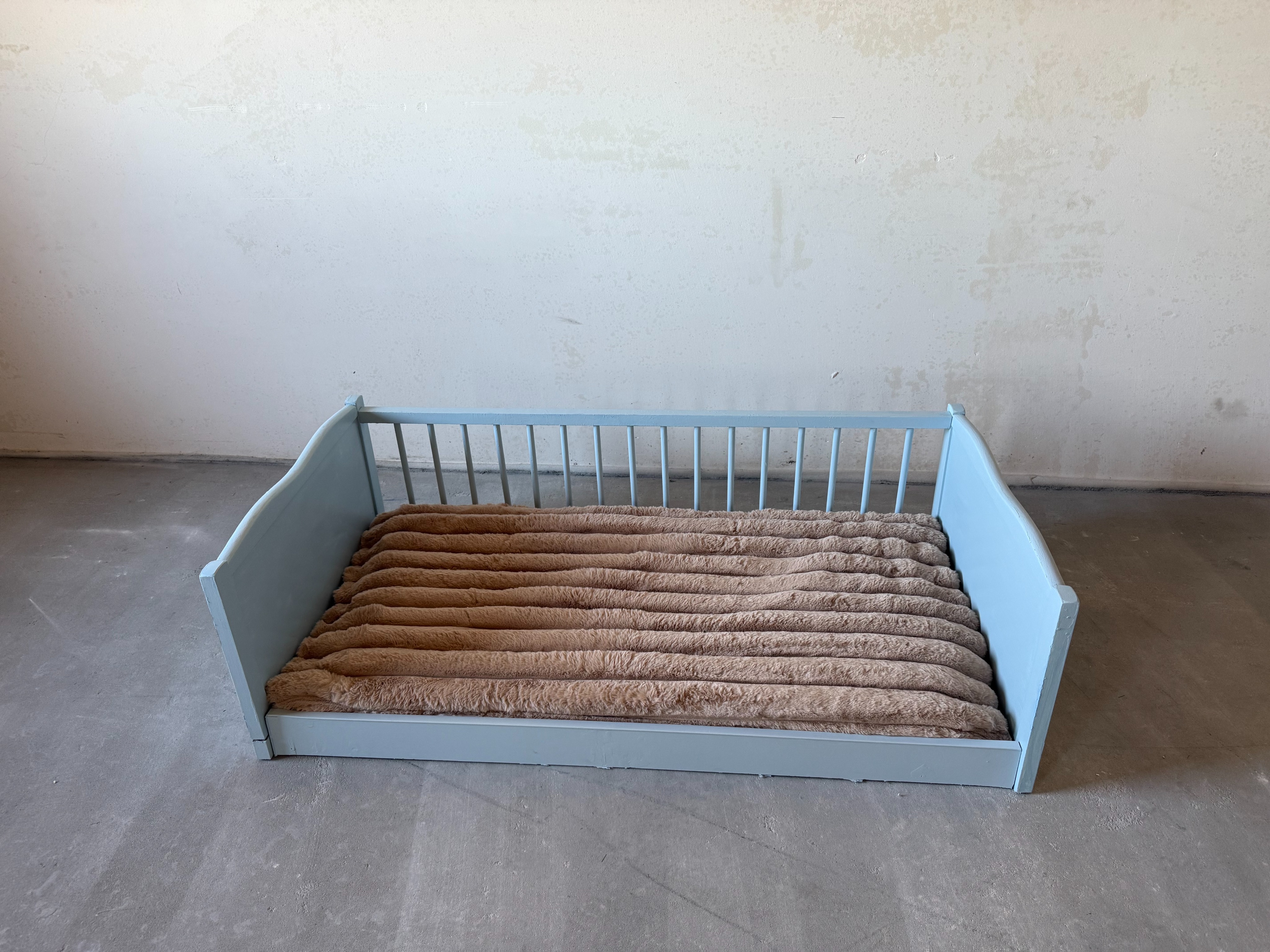 make the background plain white make the lighting studio lighting the bedframe is baby blue make a cute hapy looking dog lay on the object