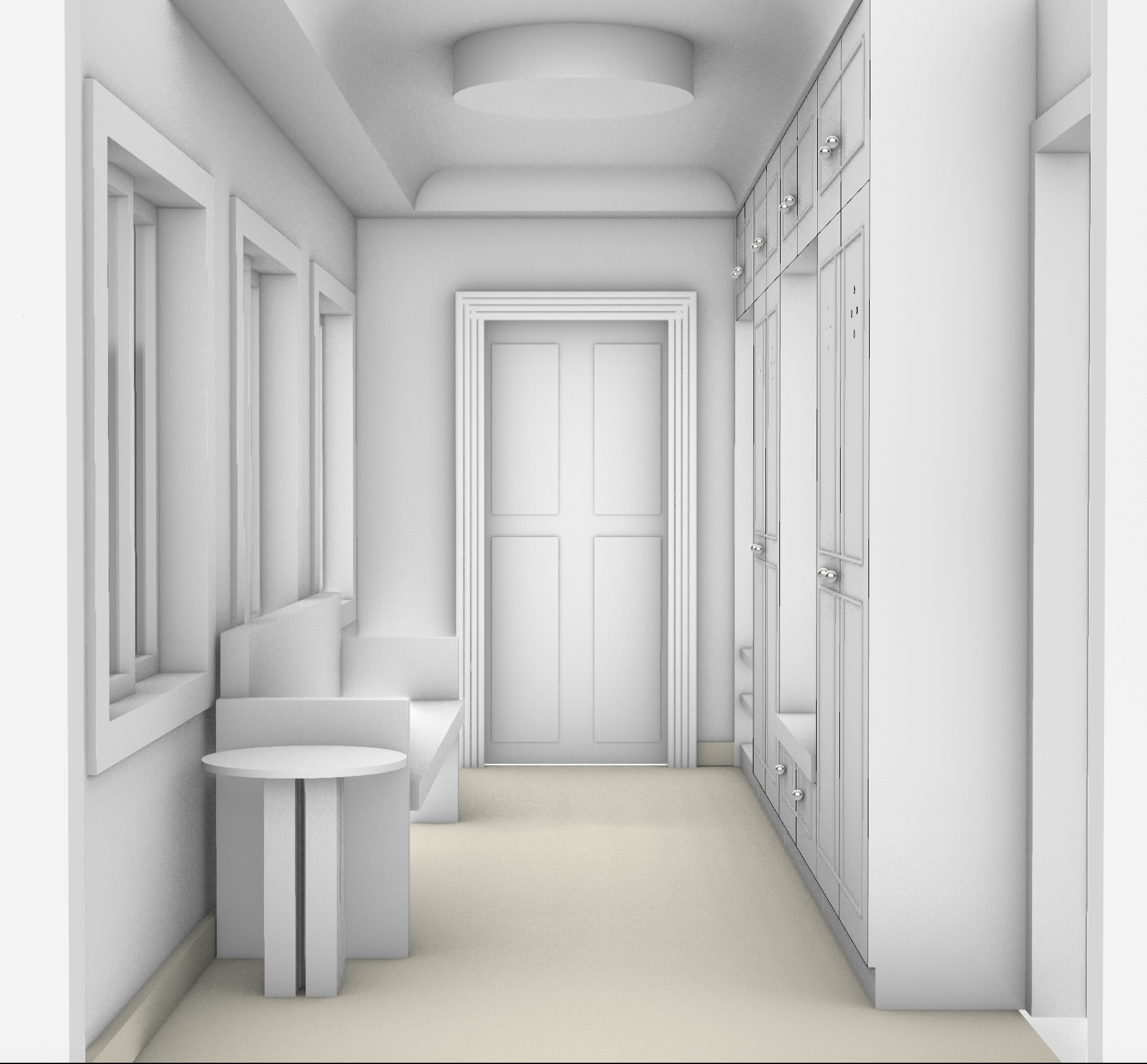 render this with a romantic morning light on it keep all the materials off white cream except the floor can be an outdoor brown red brick tile make the front door on the left a craftsman paneled door but still off white with a bronze handle make the bench on the left a oak antique church pew and add vase of lavender flowers on the table next to it the knobs on the doors should be polished nickle