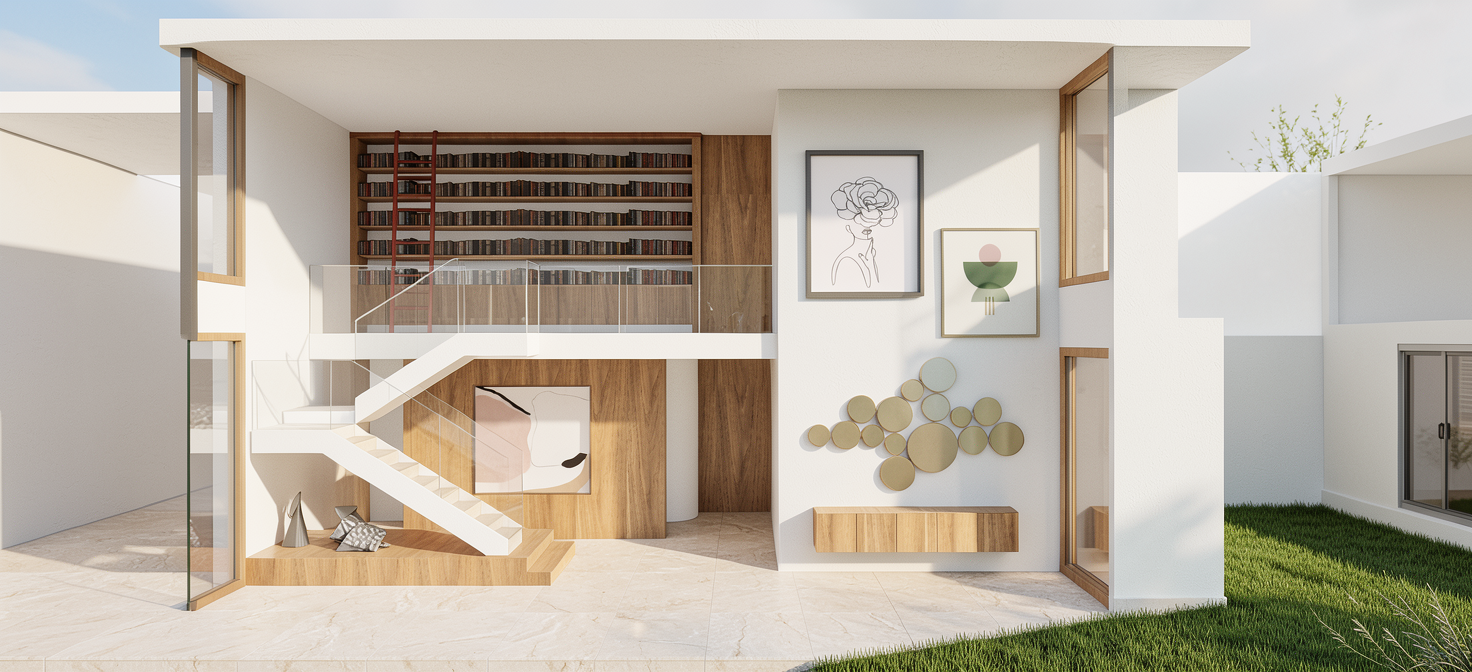 maintain all the information on this image except for the stairs stairs propose new staircase design the design should be more solid not glass railings the design should be modern for the staircase design remove the wooden platform on the floor and prolong the staircases all the way to the floor