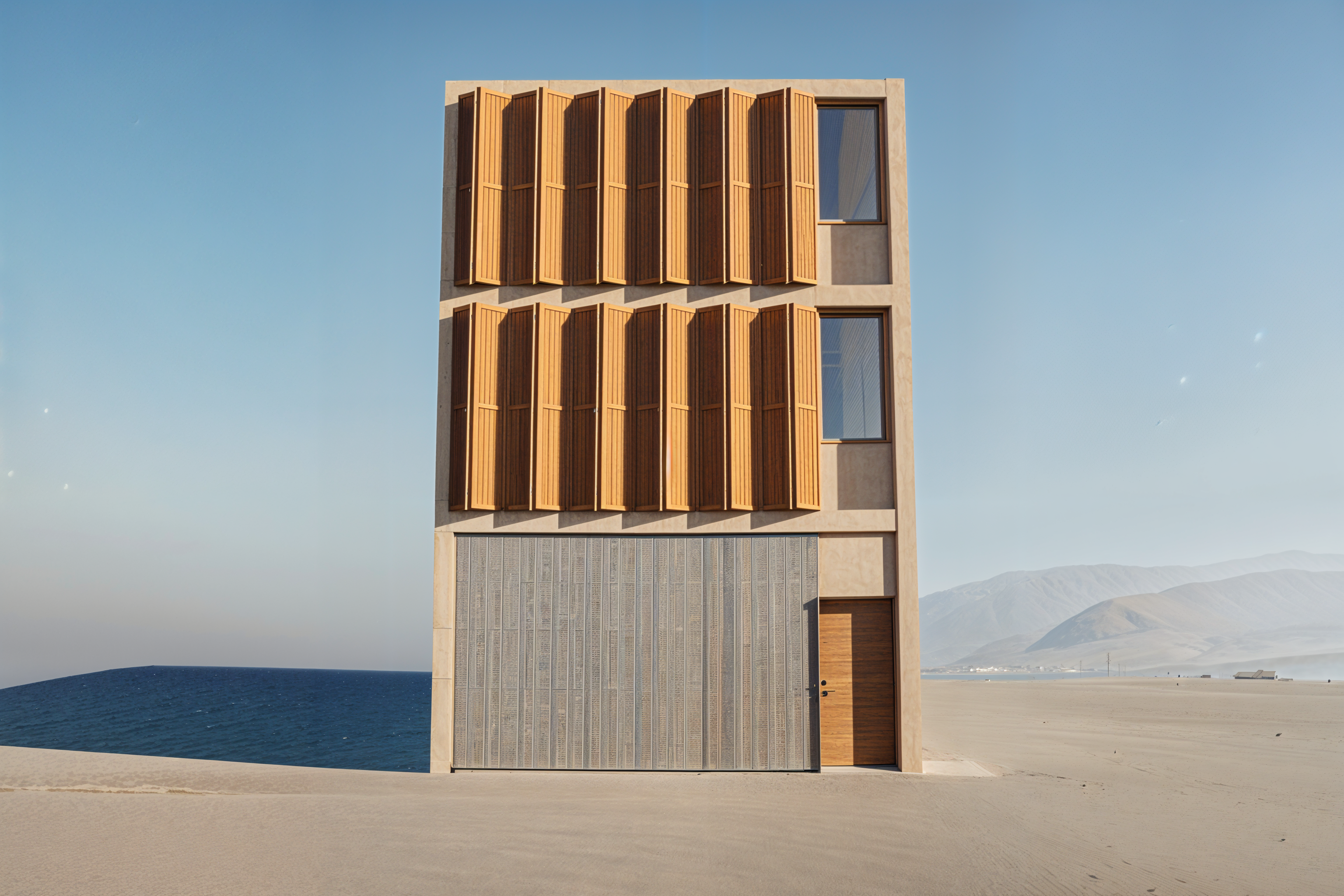 cambia la parte de abajo que son listones de madera grises por un muro de bloques de vidrio de pav