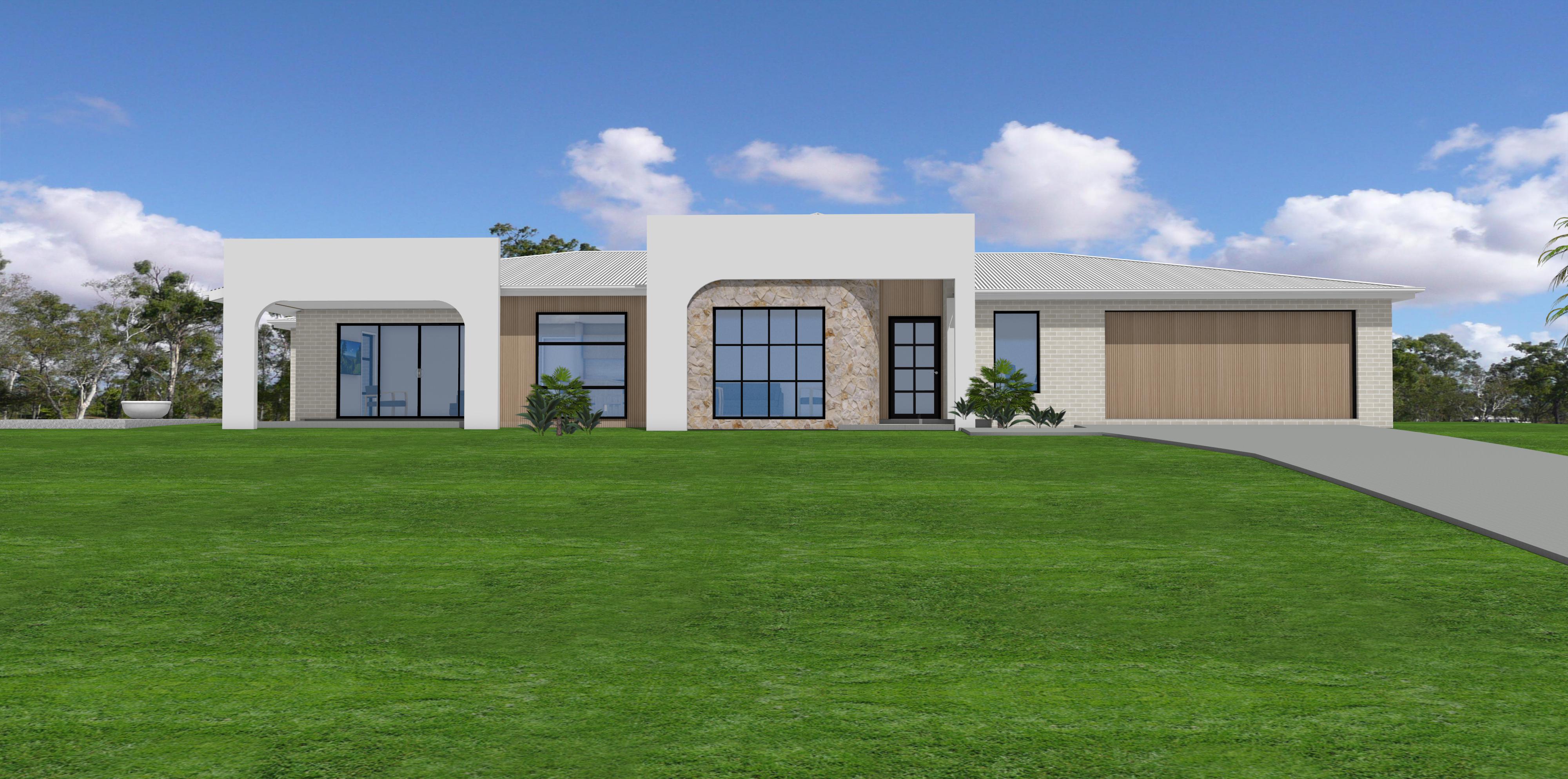white roof white brick and timber walls with white render features grass lawn with small landscape features black widow frames