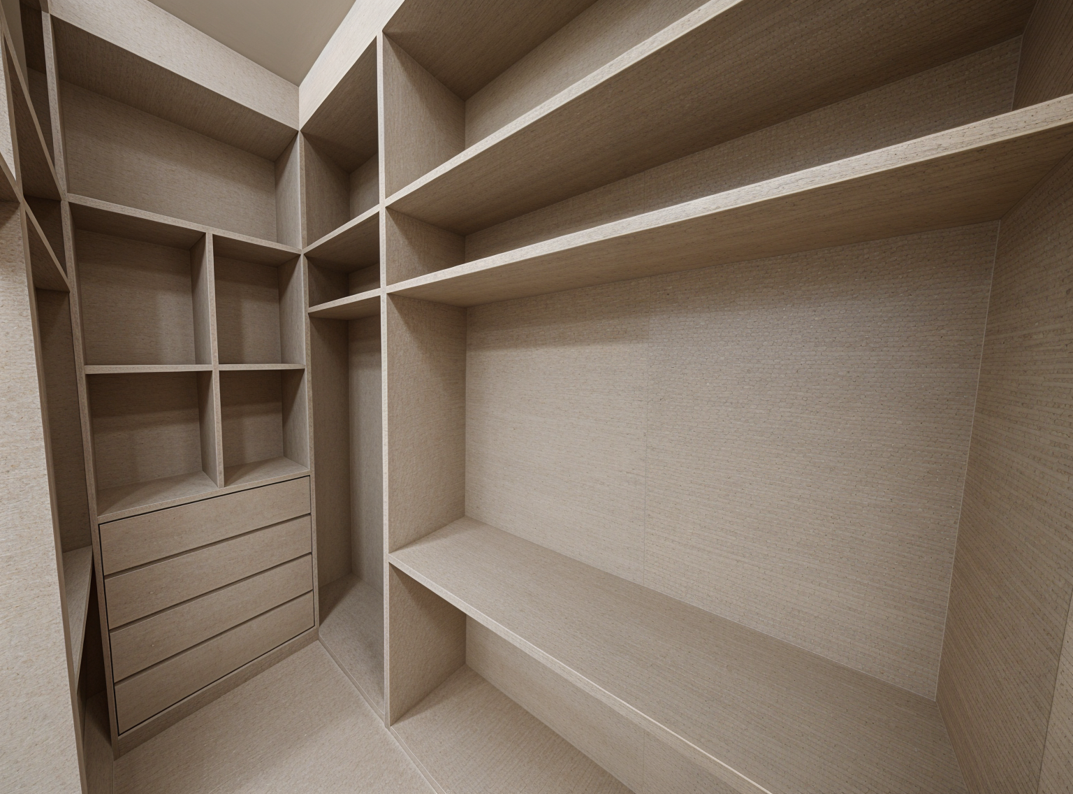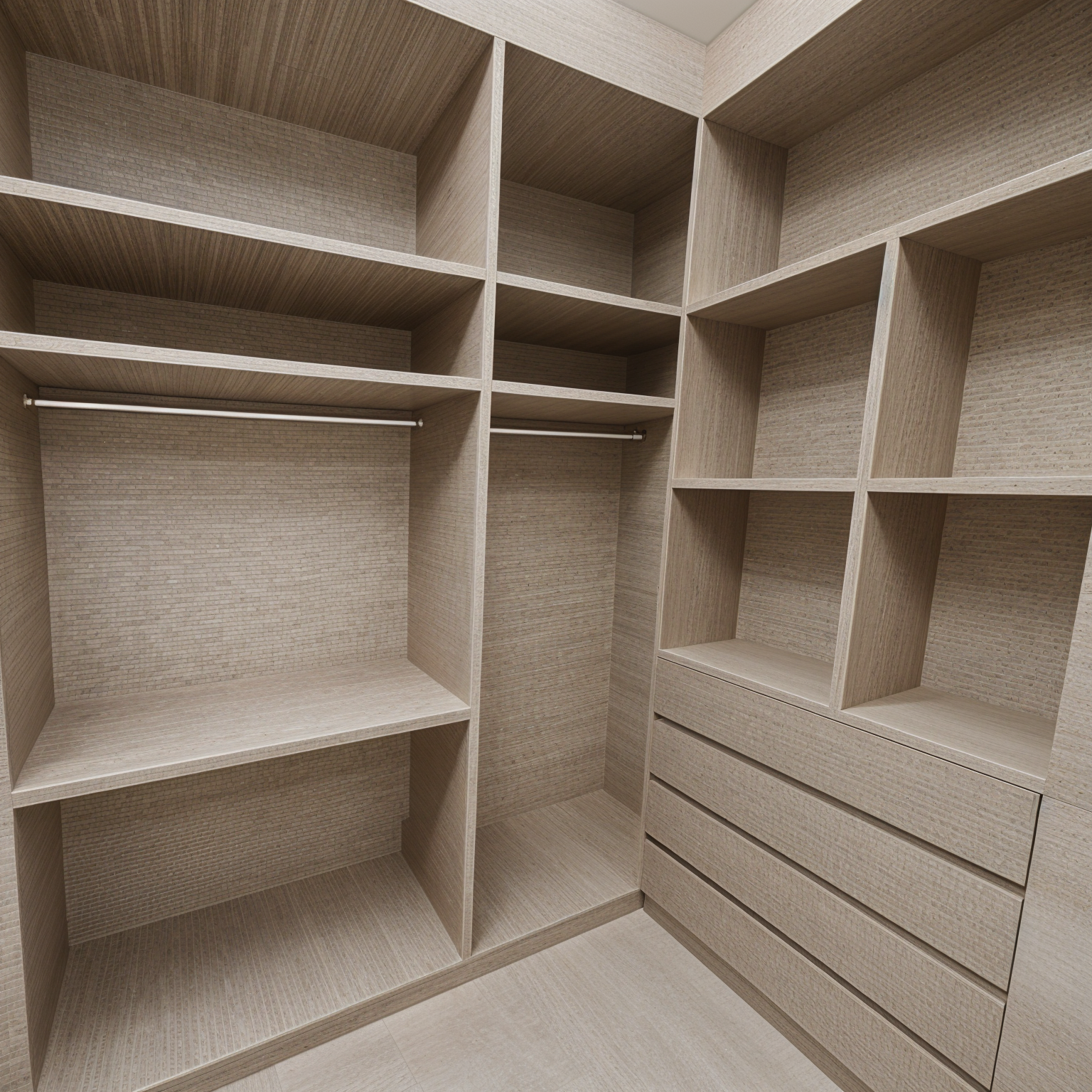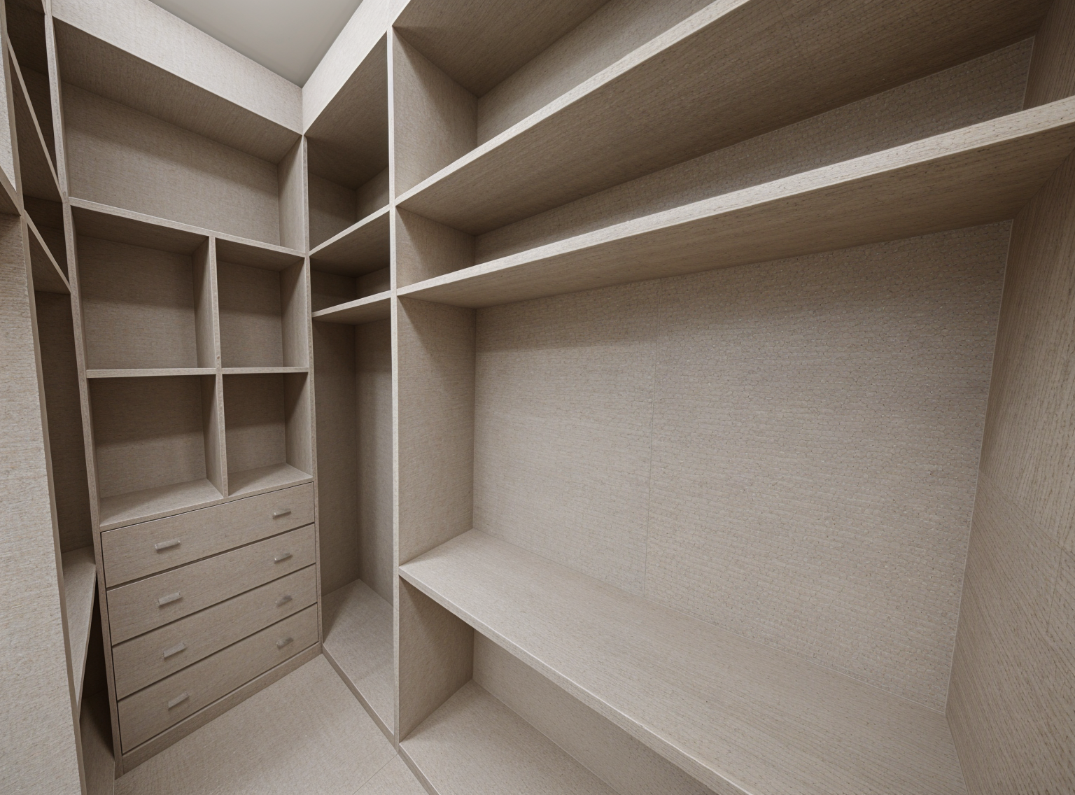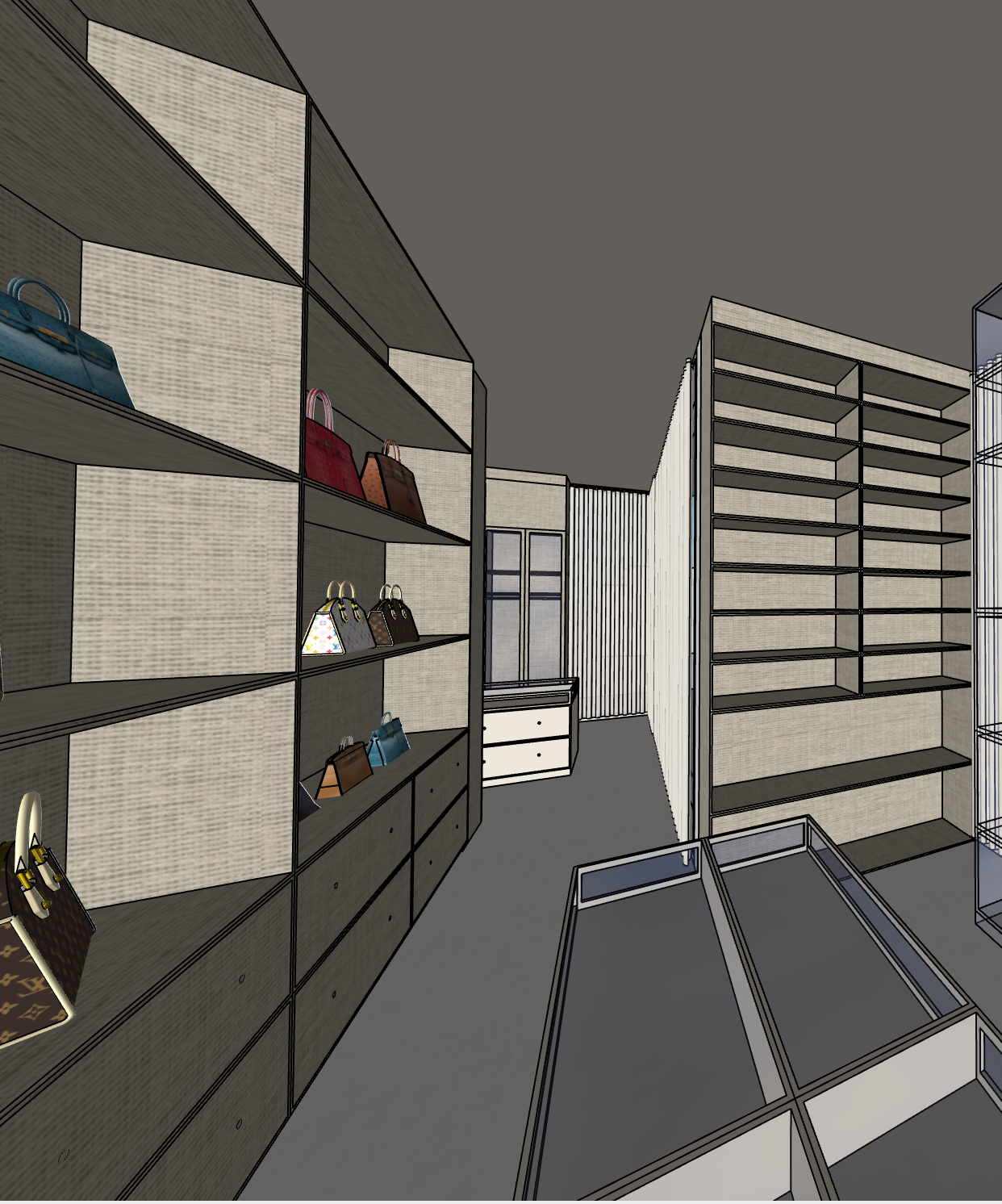 render a luxurious woman s walk in closet featuring sleek modern cabinetry with a light beige finish incorporate glass doors with subtle reflections creating a sense of openness use warm ambient lighting to evoke a cozy and inviting atmosphere the floor should be a smooth matte ivory tile add brass handles for a touch of sophistication the overall vibe should be elegant and serene with a focus on luxury and organization a beautiful display of purses