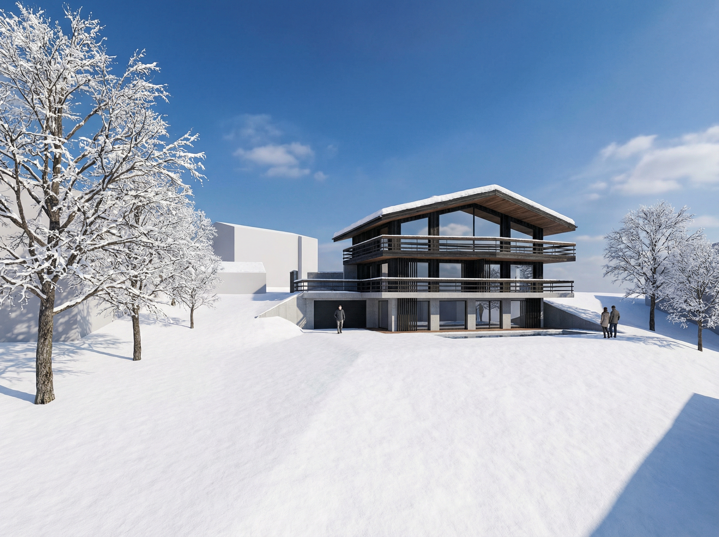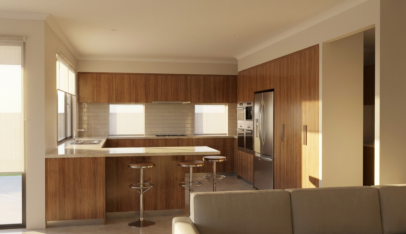 the rangehood is integrated in the overhead cupboards add some evenly spaced down lights to the ceiling and a simple modern pendant light above the stools add some designer kitchen ware items to the bench top add a bowl of fruit add a bottle of wine and 2 glasses to the benchtop near the stools