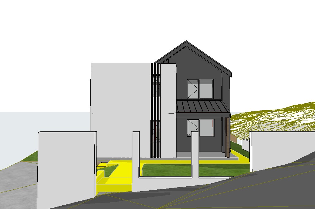 barndominium exterior shot in an australian rural setting at sunset with a lush green garden external colour pallette of white and soft grey architecture change background to forest keep color combinaton to facade and wood insertion to faccade