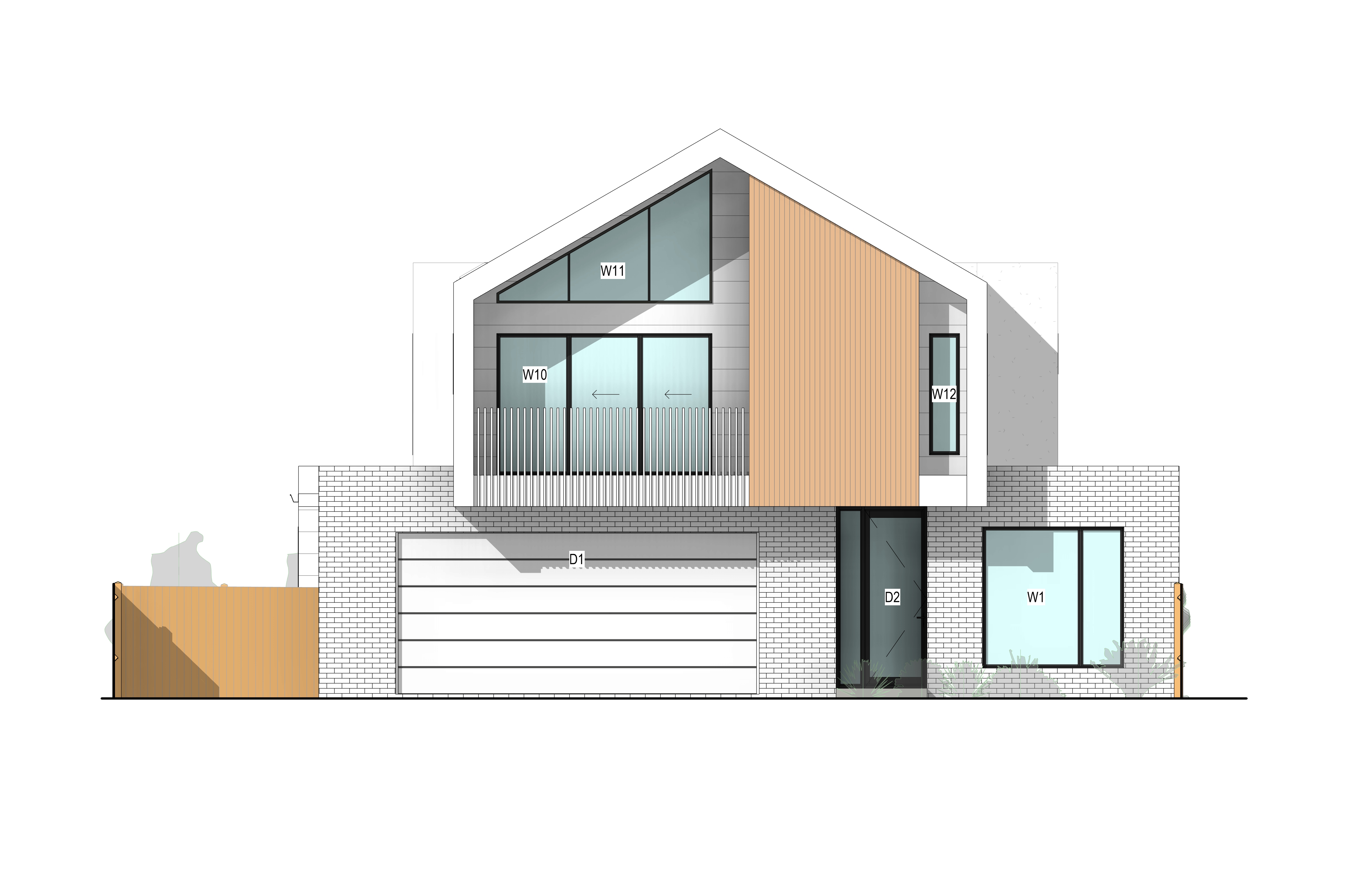 exterior shot modern minimalist house with a slanted roof featuring a combination of white brick and natural wood paneling large windows with blue tinted glass and sleek black frames the garage door and front door are both in a modern style with the main door having frosted glass surrounding atmosphere is a serene suburban setting with soft morning sunlight casting gentle shadows the overall mood is calm and inviting emphasizing clean lines and natural materials