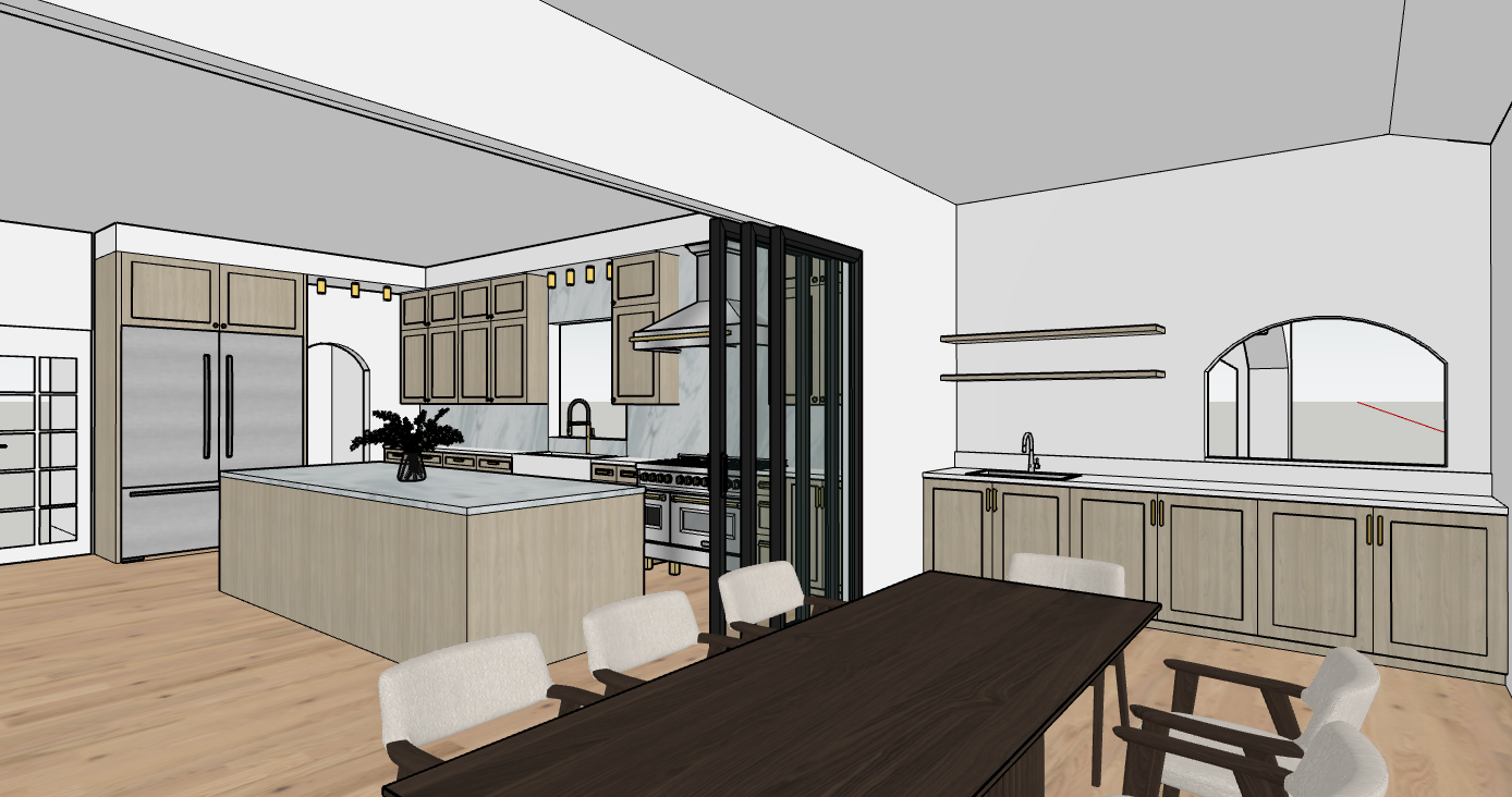 brighter interior shot with recessed lights on ceiling put food on the counter and stuff on the shelves