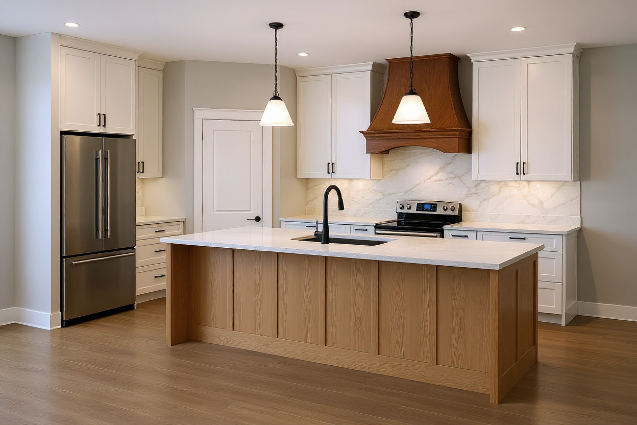 keep everything the same but add a wood trim piece around the range hood extend the range hood on each side so it touches the cabinets
