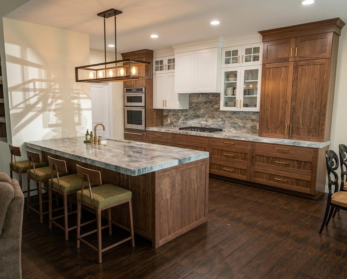 create a hyper realistic rendering with soft morning light through the windows interior shot of modern flat kitchen natural oak wood cabinets comfy sofa with throw and artwork above it tone should be relaxing and inviting pendant above dining table