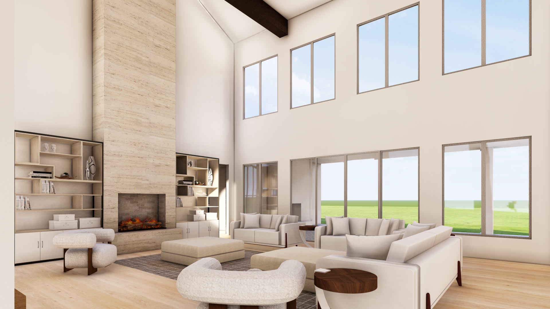 interior shot render a modern interior featuring large black framed windows allowing a soft blue sky light to flood in the walls are a smooth light cream color accentuating the height of the space the floor is a warm natural oak wood enhancing the inviting atmosphere ensure the atmosphere is bright and airy with a hint of sophistication and elegance