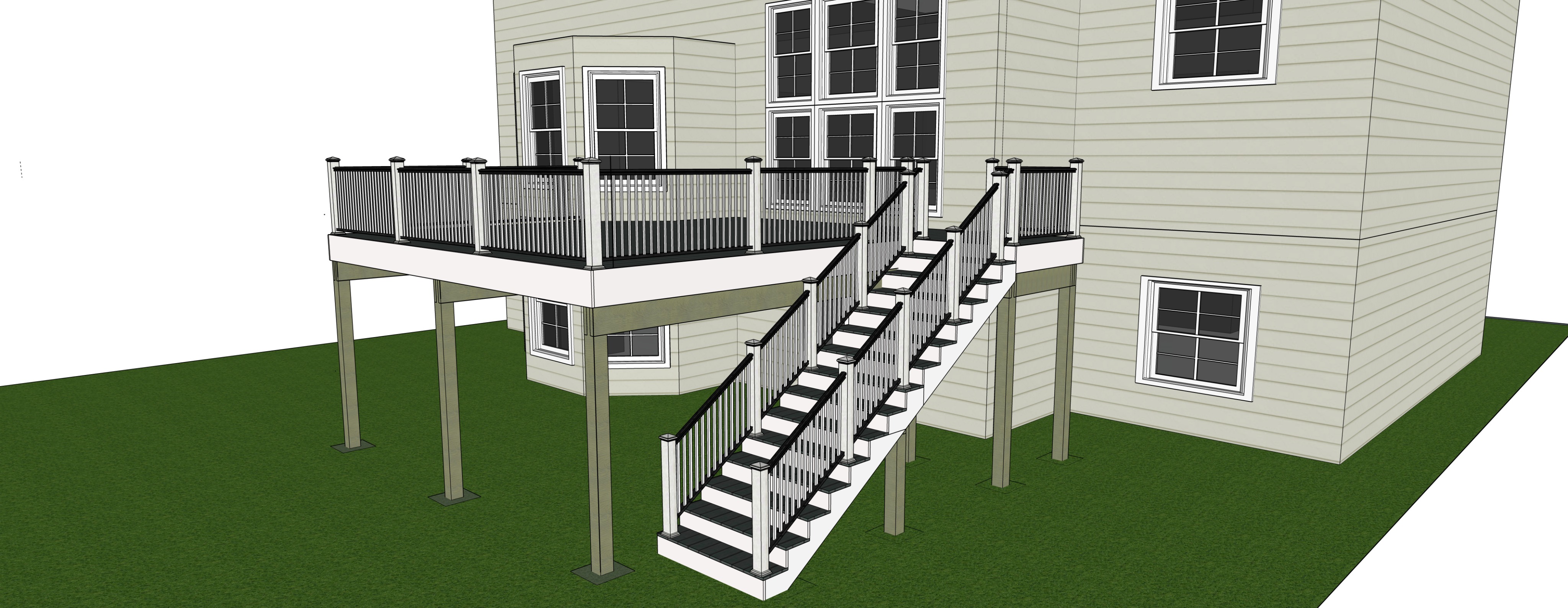 render and finish this shot add a dining table grill and people enjoying the deck keep grass on the ground level and an out door living set and a webber grill on the main deck area