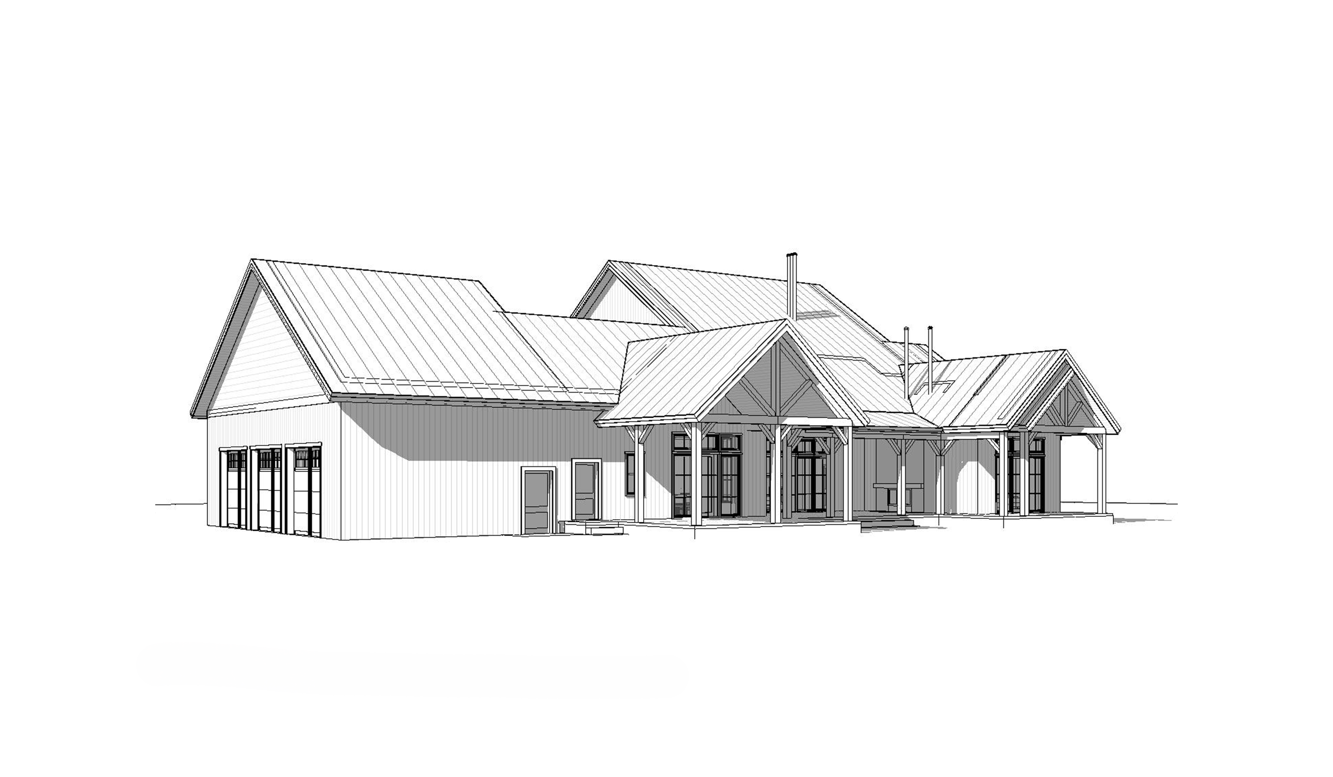 rear view of a clean mountain modern architectural exterior rendered in cinematic vibrant day time lighting with vibrant colorful skies heavy timber architectural style vertical select grade cedar siding with warm wood accents manicured landscaping around structure with hedges black standing seam metal roof prominent cinematic big mountains background high fidelity photorealistic visualization crisp shadow falloff refined facade geometry soft atmospheric depth premium architectural photography mood ultra clean composition and materials black window trim dark roof trim photorealistic render