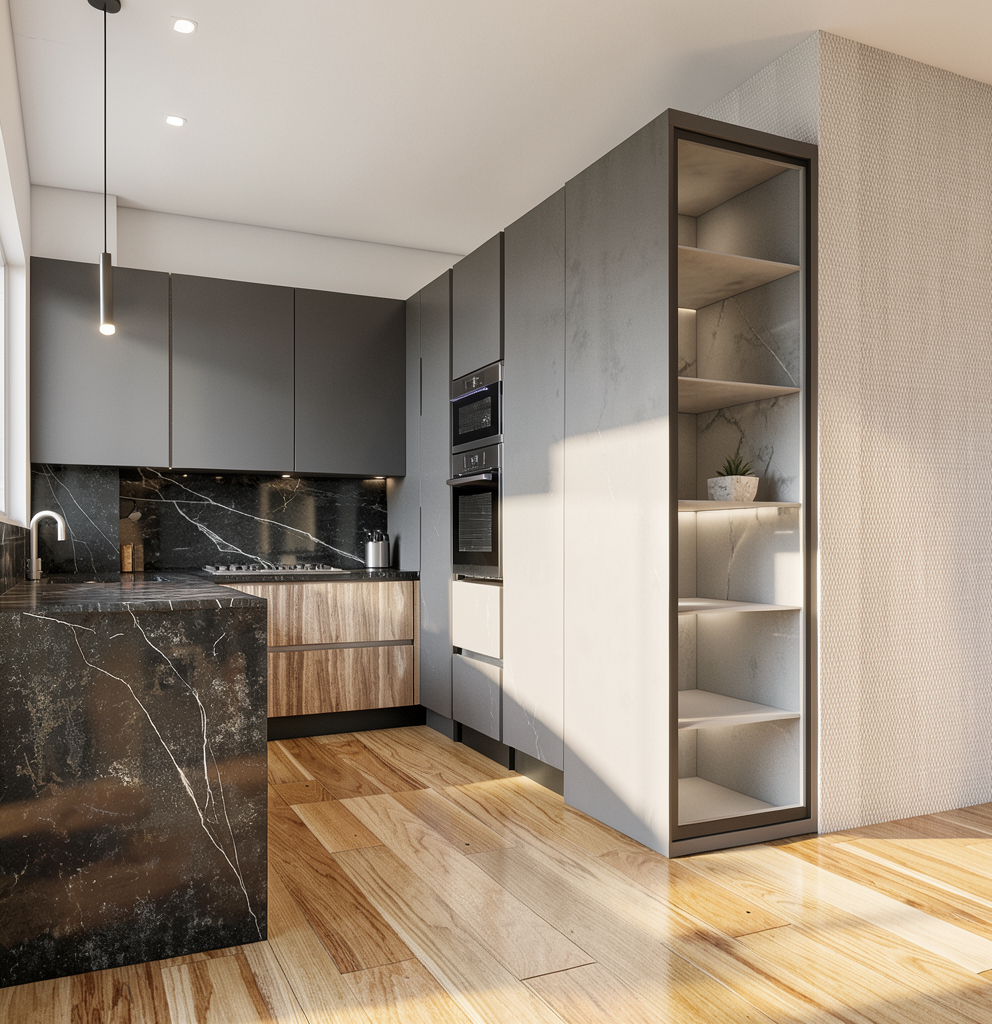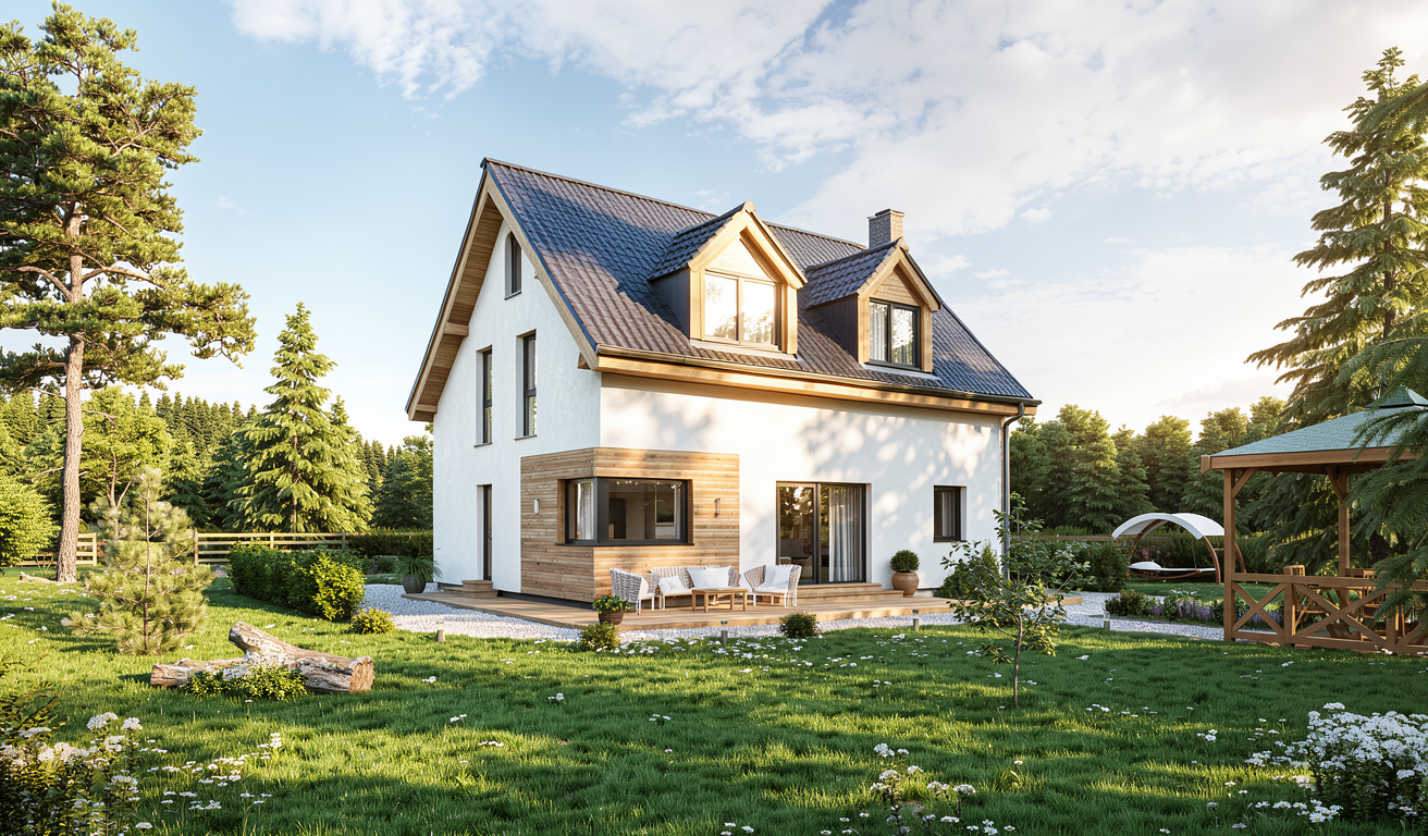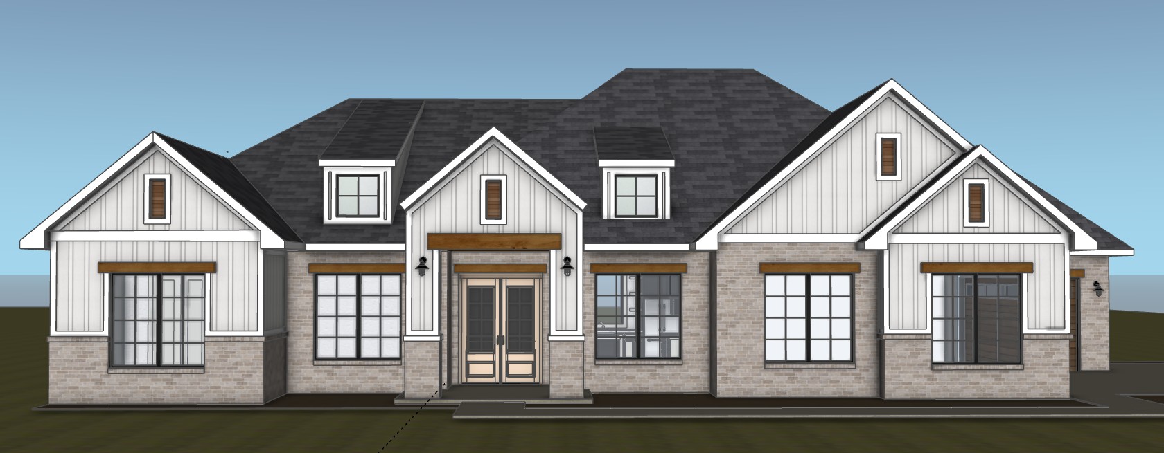 a charming modern farmhouse featuring a white and light gray brick exterior with warm wooden accents the roof is covered in dark charcoal shingles adding contrast the overall atmosphere is serene and inviting set against a clear blue sky the wooden accents should be a rich natural brown complementing the crisp white vertical siding panels the landscaping is lush and green enhancing the peaceful ambiance