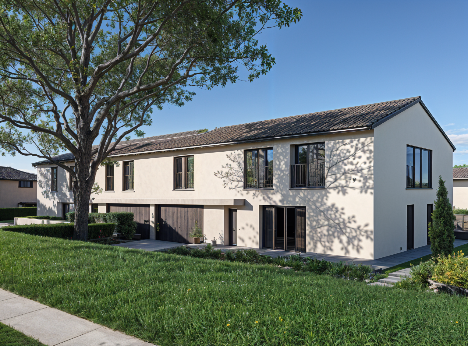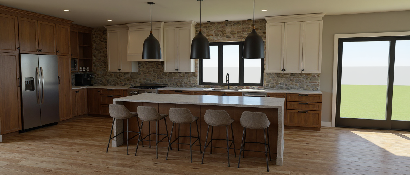render a modern kitchen with a rustic touch the kitchen should have a warm inviting atmosphere use a palette of earthy tones and natural materials the cabinets are white with detailed trim the backsplash is a textured stone in various shades of light gray and beige while the lower cabinets and kitchen island feature warm oak wood the countertops are sleek and grey the lighting is modern with black pendant lights hanging above the island the appliances are stainless steel use natural light streaming in from large windows the floor is a natural light wood the overall ambiance should be cozy yet modern blending rustic charm with contemporary design adds a countryside landscape behind the windows and rays of sunlight inside