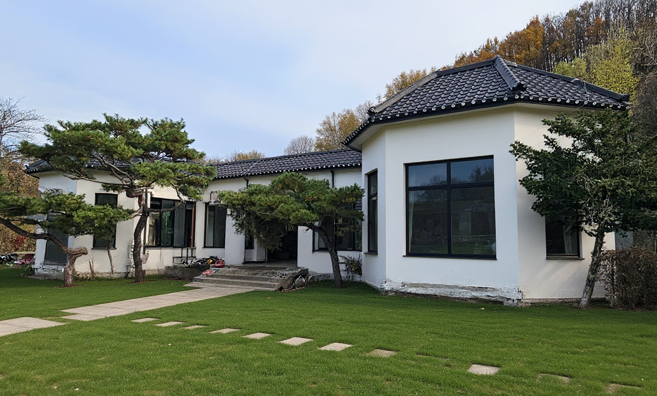 maintaining the shape of the building modern style industrial black frame canopy concrete keep the canopy column wall finishing white color and plywood remove the arch the window is a fixed window frame the front garden has grass and stepping stones it s like a calm china restaurant