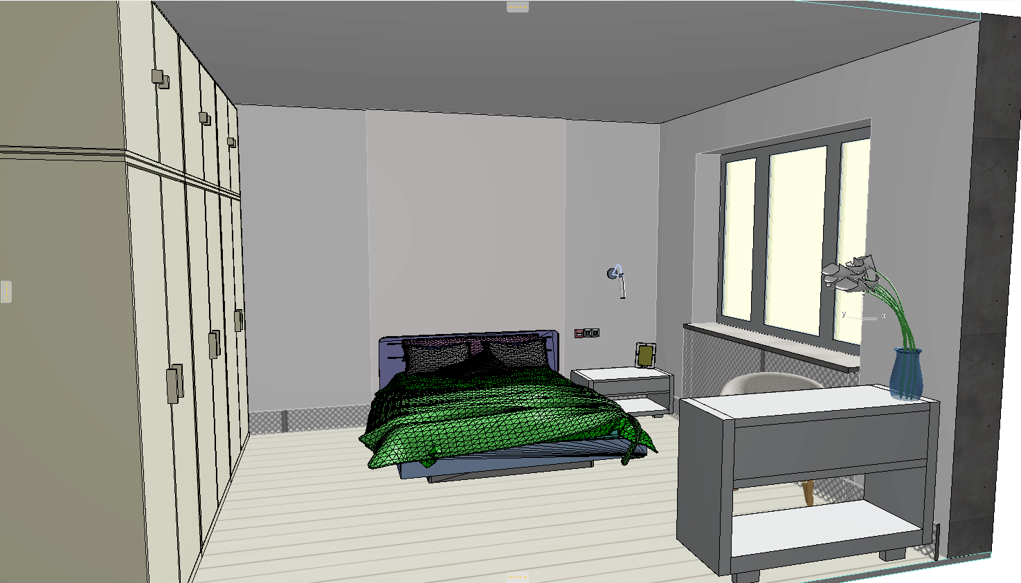 art nouveau interior shot a modern bedroom with a calm and cozy atmosphere the walls are a soft warm gray the bed is dressed with an elegant emerald green cover and matching pillows the floor is light oak wood exuding warmth wardrobes and side tables are sleek and minimalistic in a pale taupe color a dark navy vase with lilies and a soft glowing wall lamp provide warm ambient lighting the window lets in gentle natural sunlight adding a welcoming vibe the overall ambiance is peaceful and inviting perfect for relaxation architecture